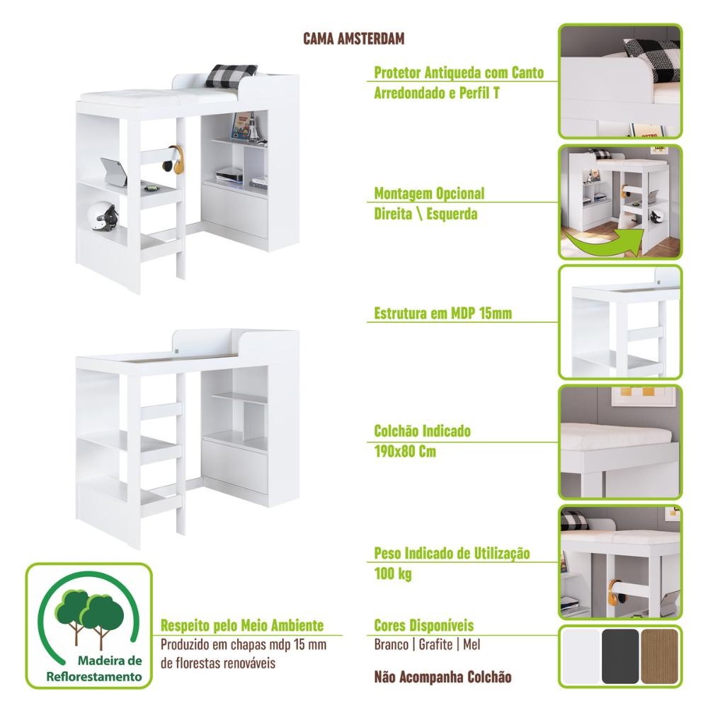 Cama Multifuncional Solteiro 1 Porta 3 Prateleiras CA6080 78x188cm Grafite - Art In Móveis