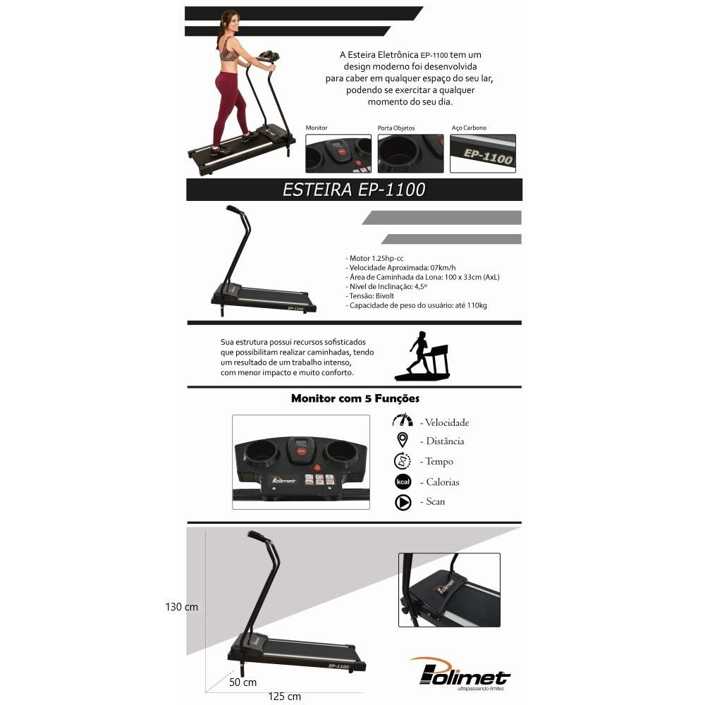 Esteira Elétrica Ergométrica Polimet EP 1100 Preto Residencial Profissional Fitness BIVOLT 5 Funções