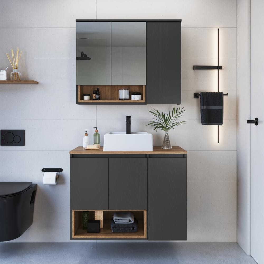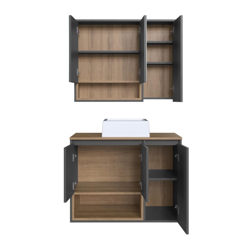 Gabinete de Banheiro 80cm com Cuba e Espelheira 3 Portas Mel/Grafite Cecília CJ9220 - Faema Móveis
