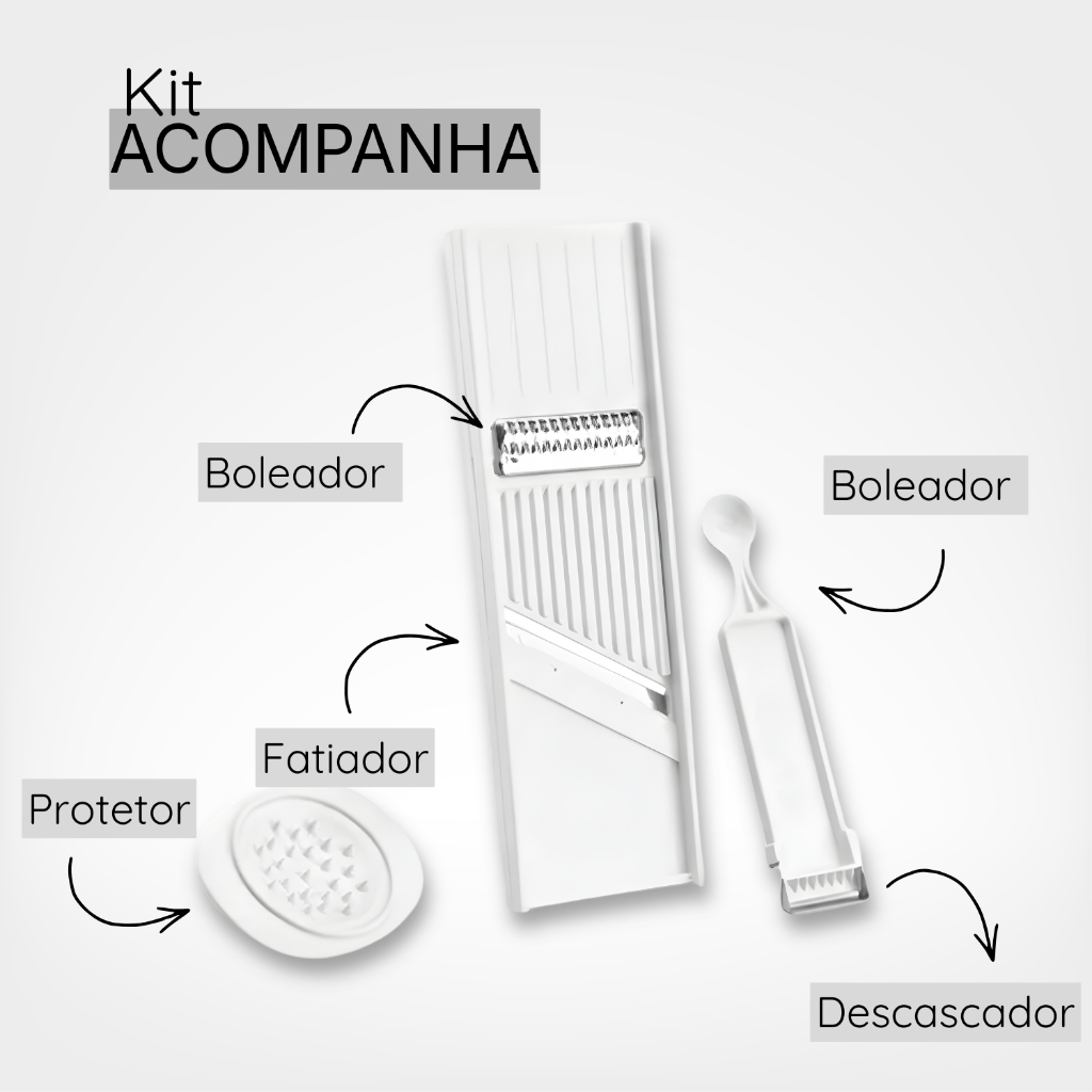 Fatiador Ralador de Legumes 4EM1 Dupla Face Mandolin Cortador Descascador Boleador Aço Inox Plástico