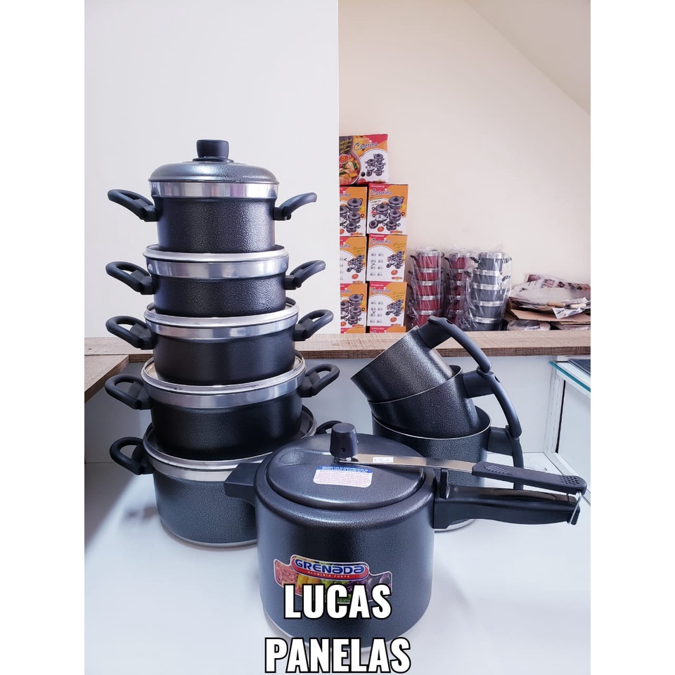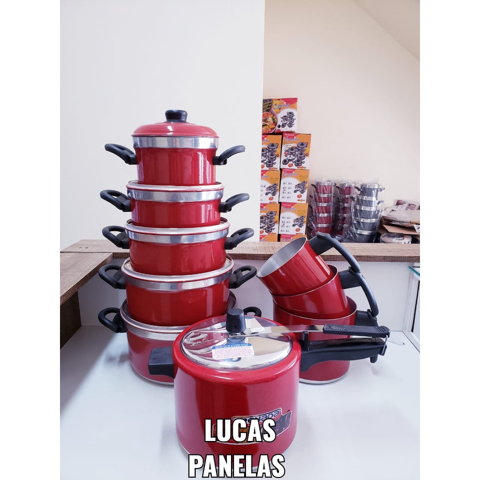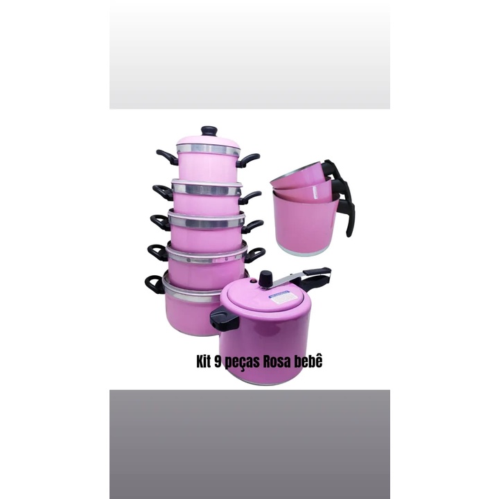 Jogo de panelas rosa 9pçs incluso canecos e panela de pressão 4,5 Litros