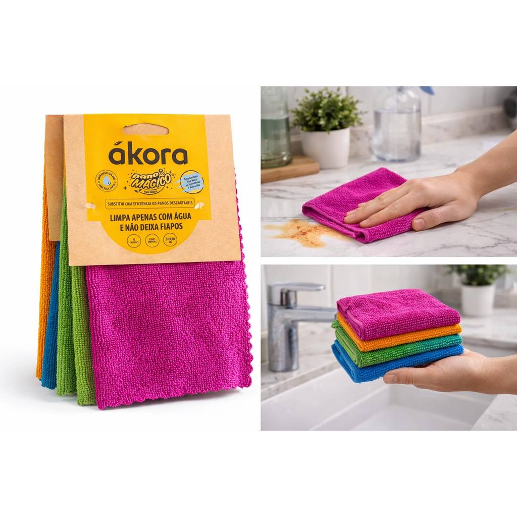 Pano Mágico Ákora kit 4 Peças, 30x30cm Sem Costura Uso Geral Colorido