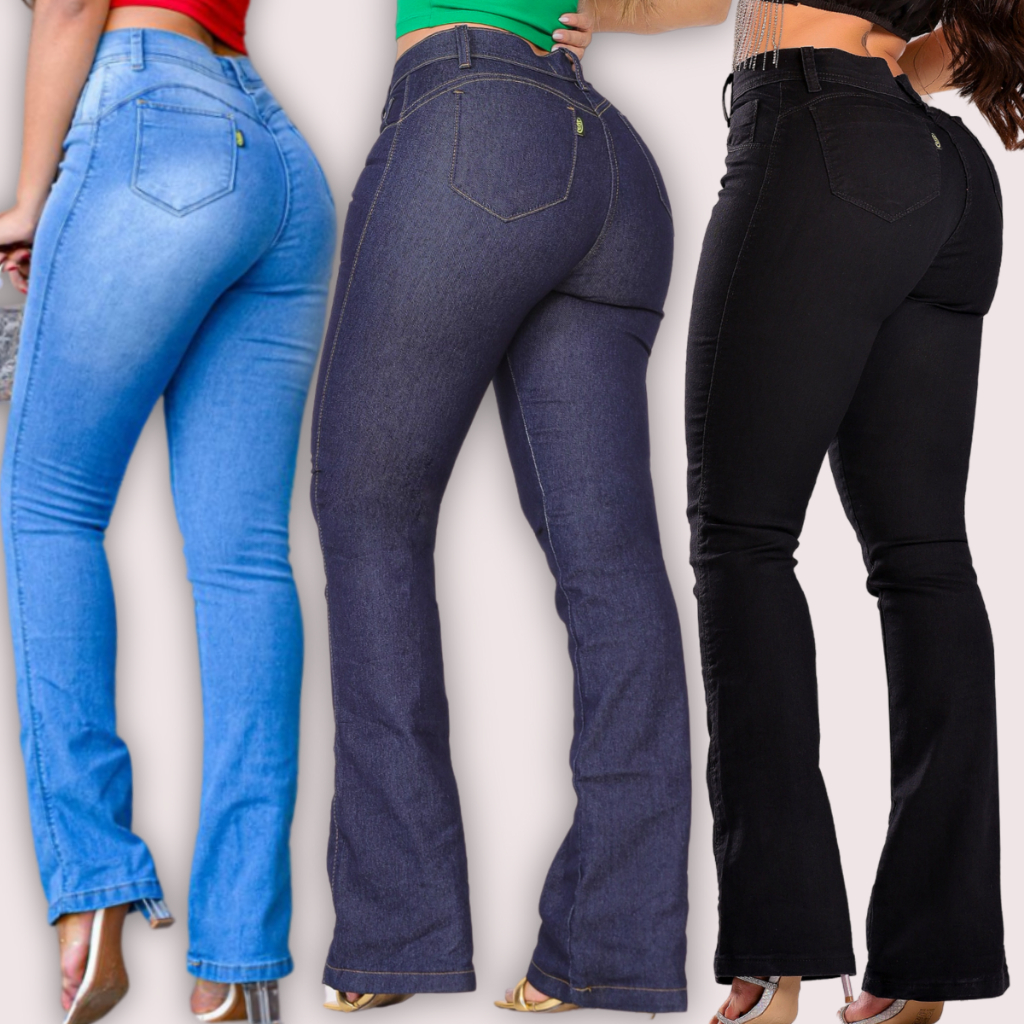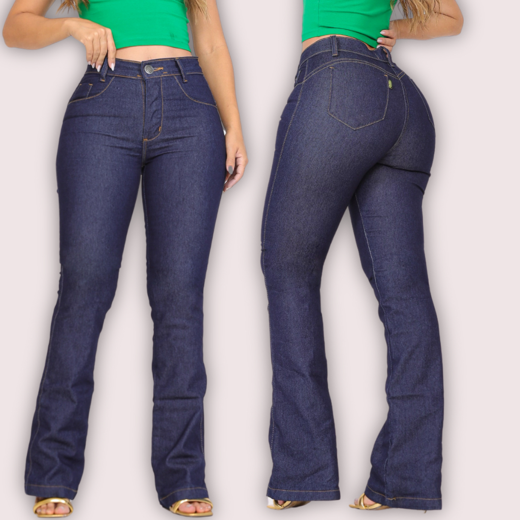 Calça Jeans Feminina Flare Cós Alto Levanta Bumbum Hot Pants Lycra Cintura Alta