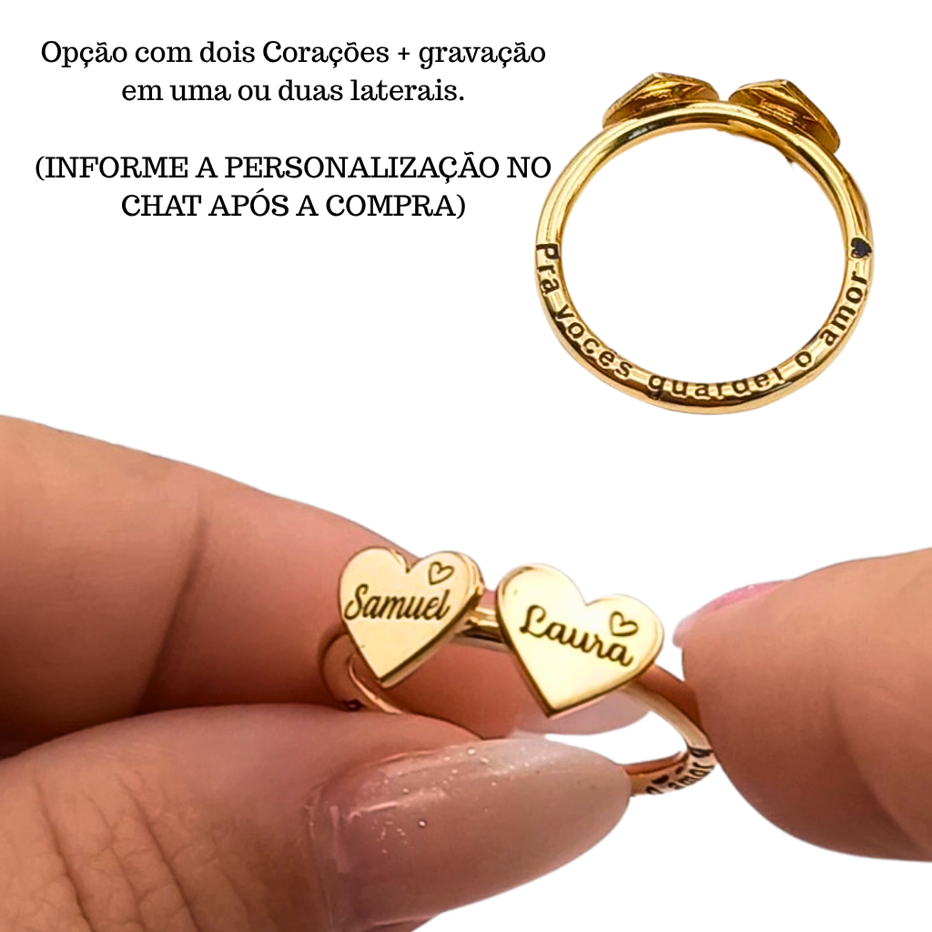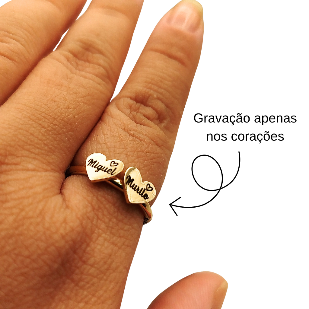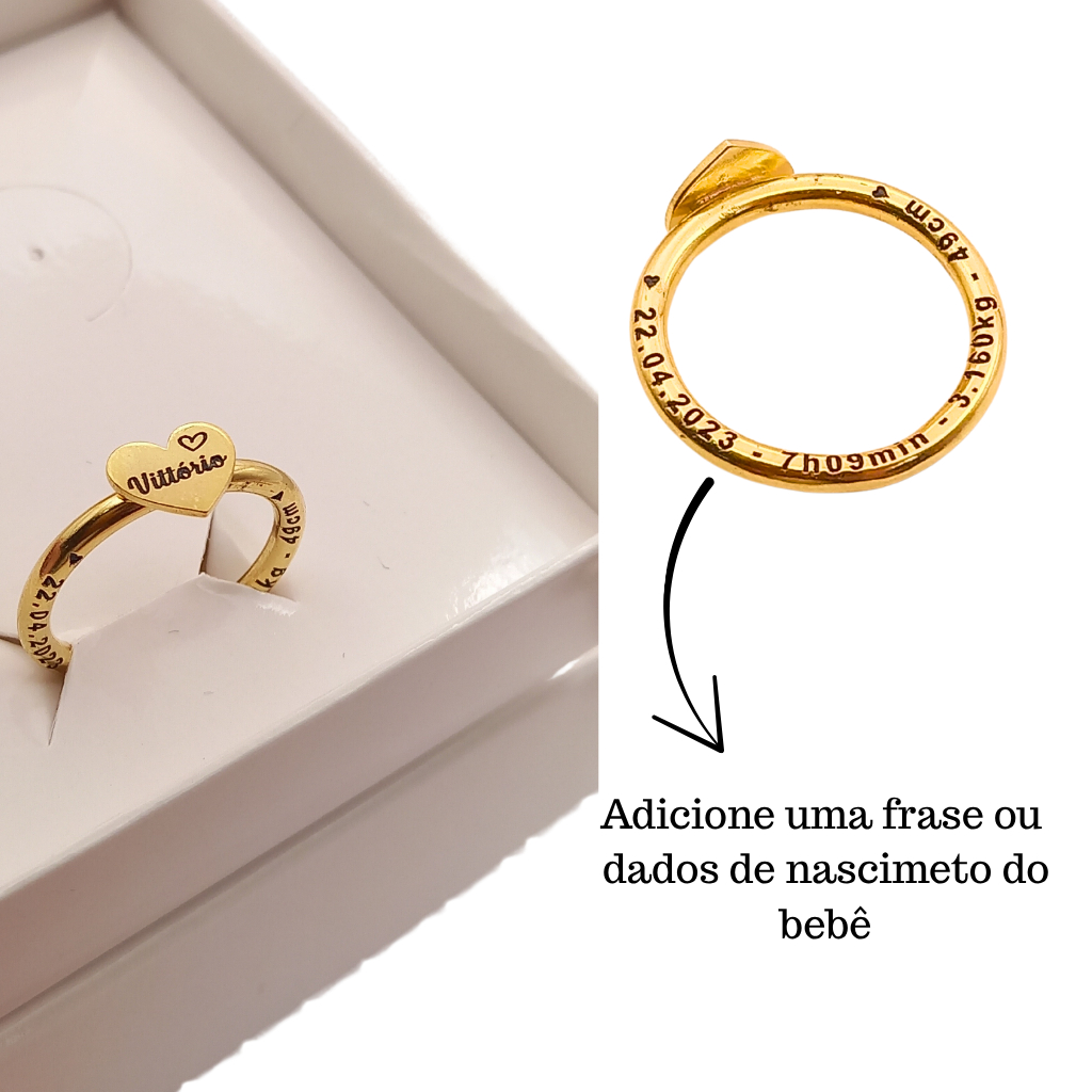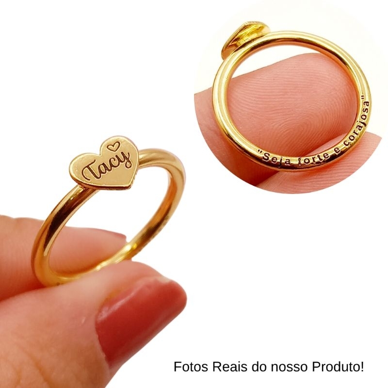 Anel coração personalizado com nome e gravação lateral banhado a ouro 18k presente mãe namorada