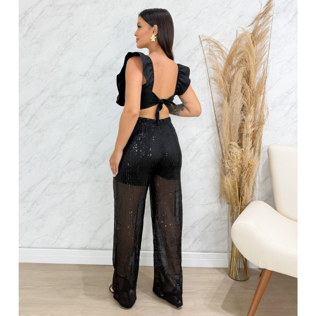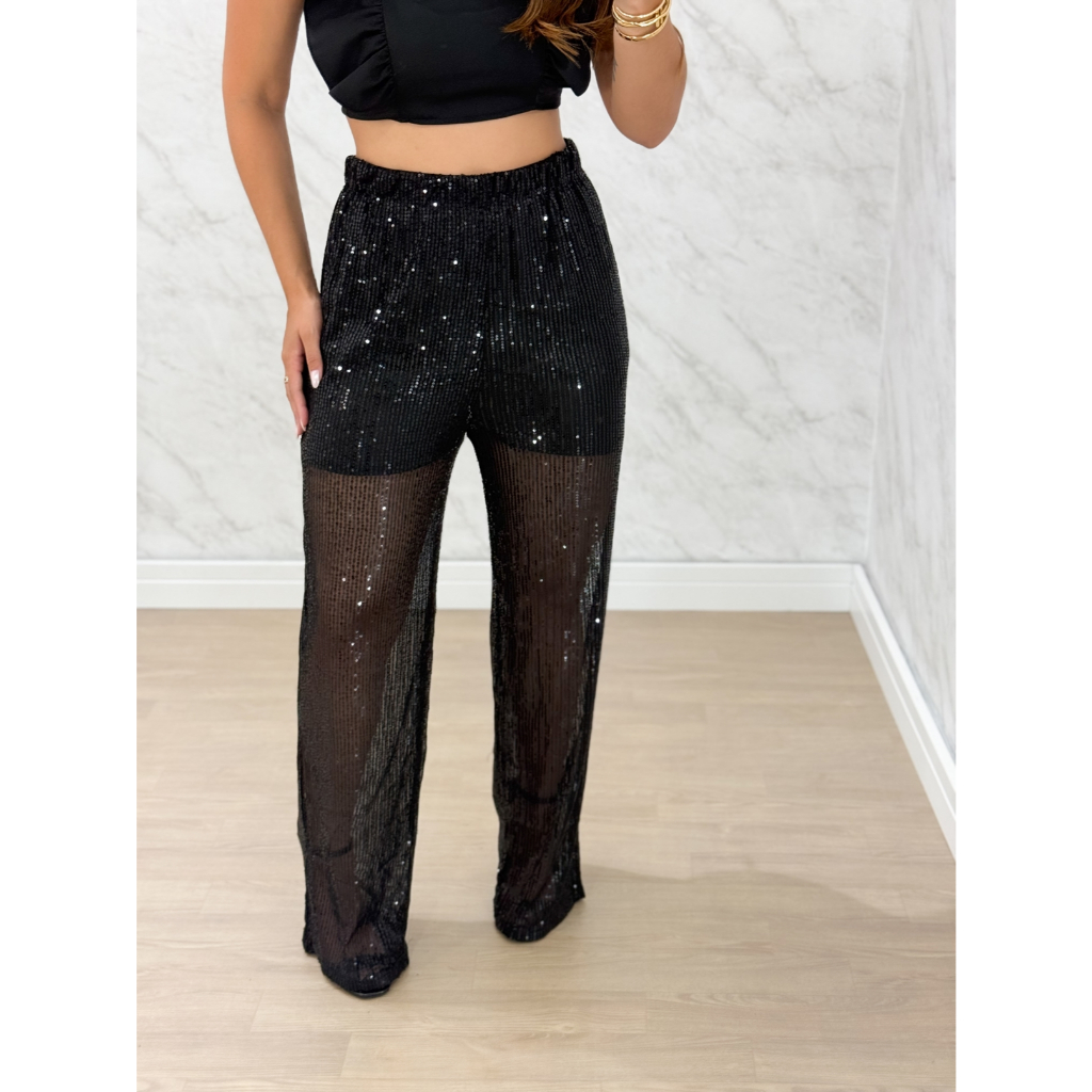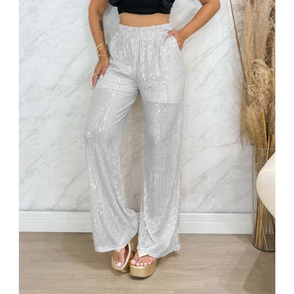Calça Feminina de Festa Pantalona de Paetê Brilho Forrada