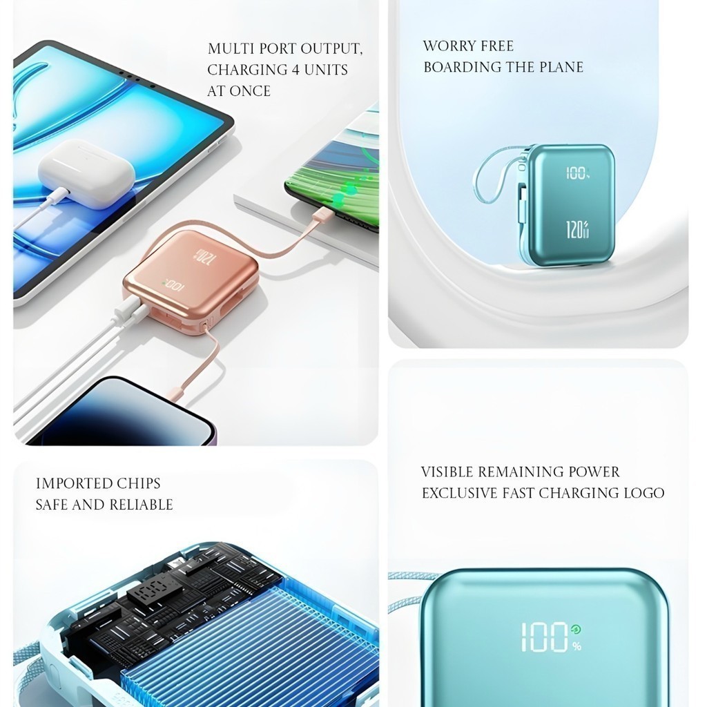 Mini power bank portátil 20.000 mAh com IOS e cabo Tipo C