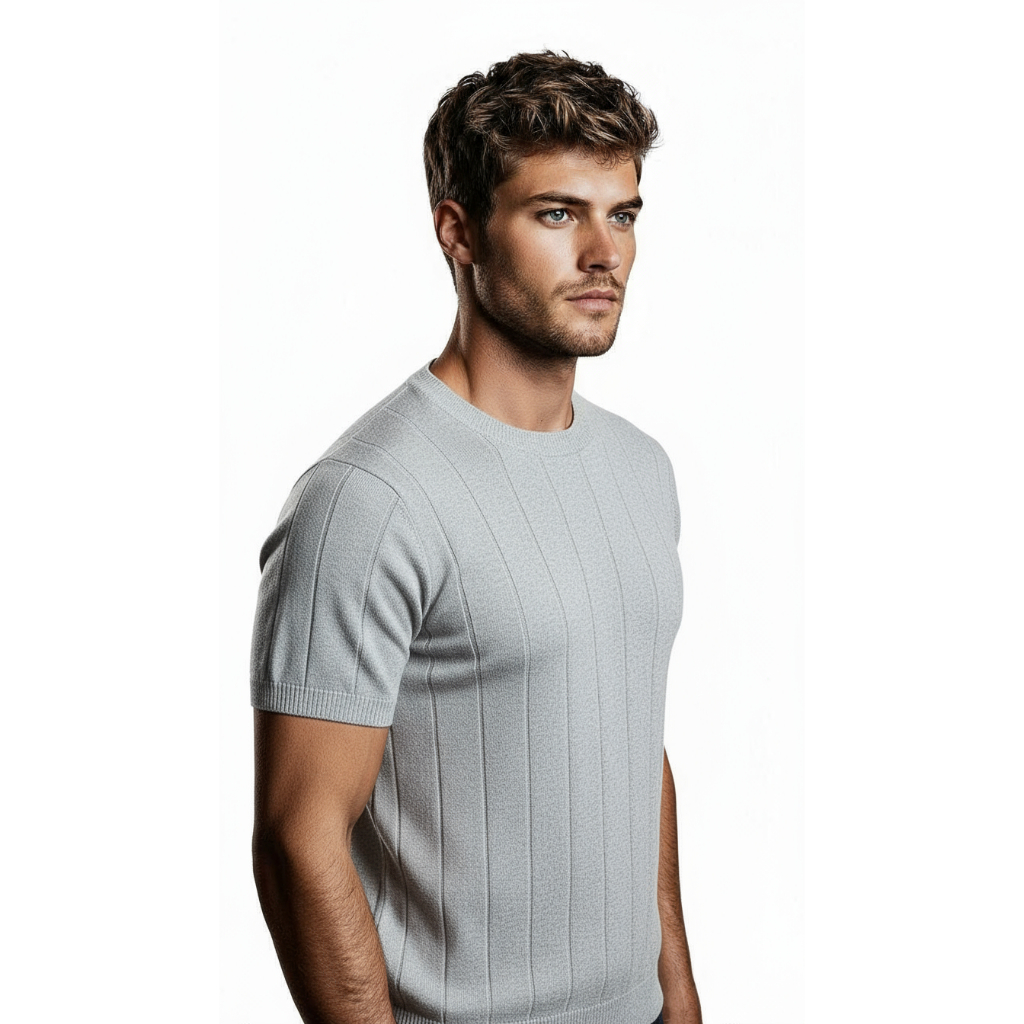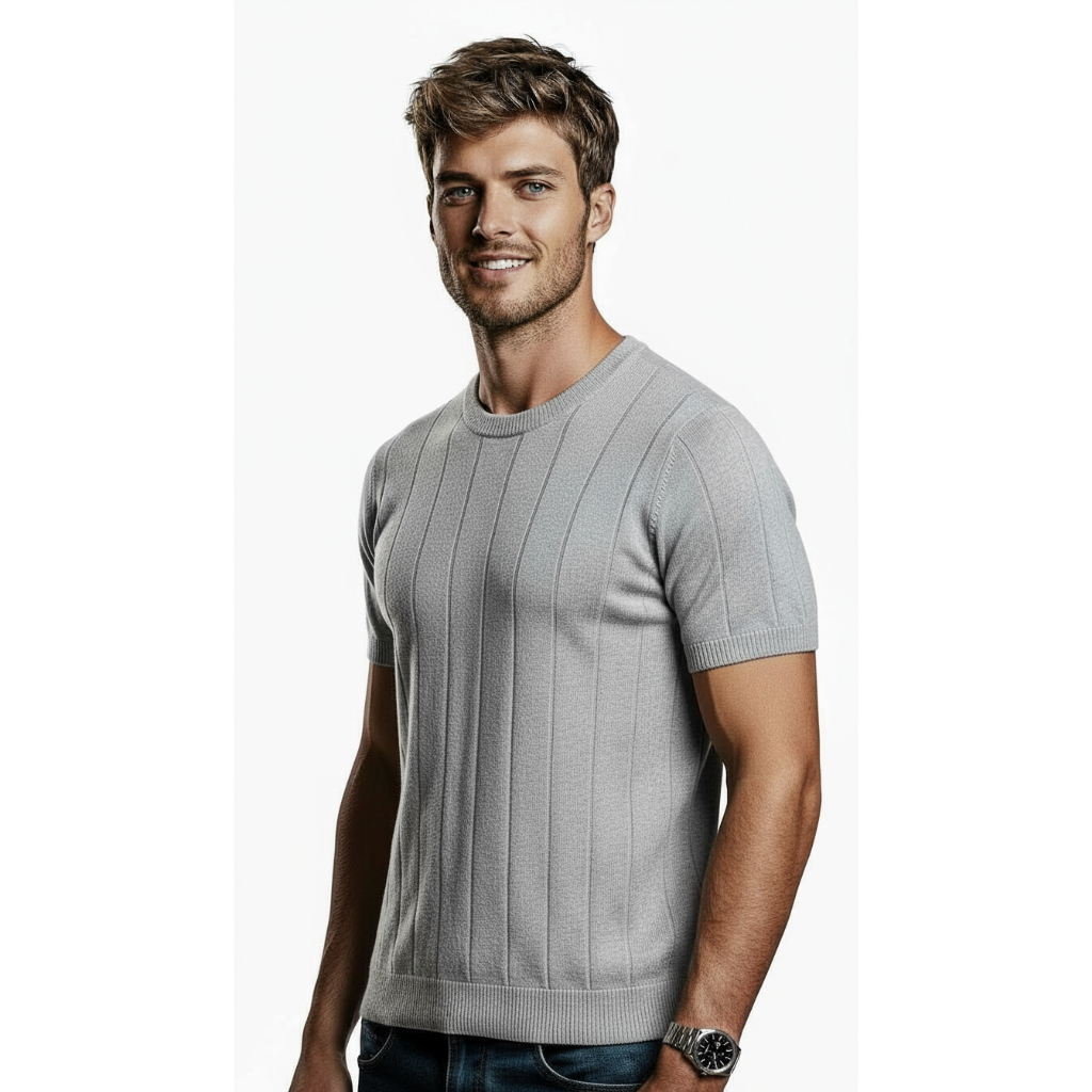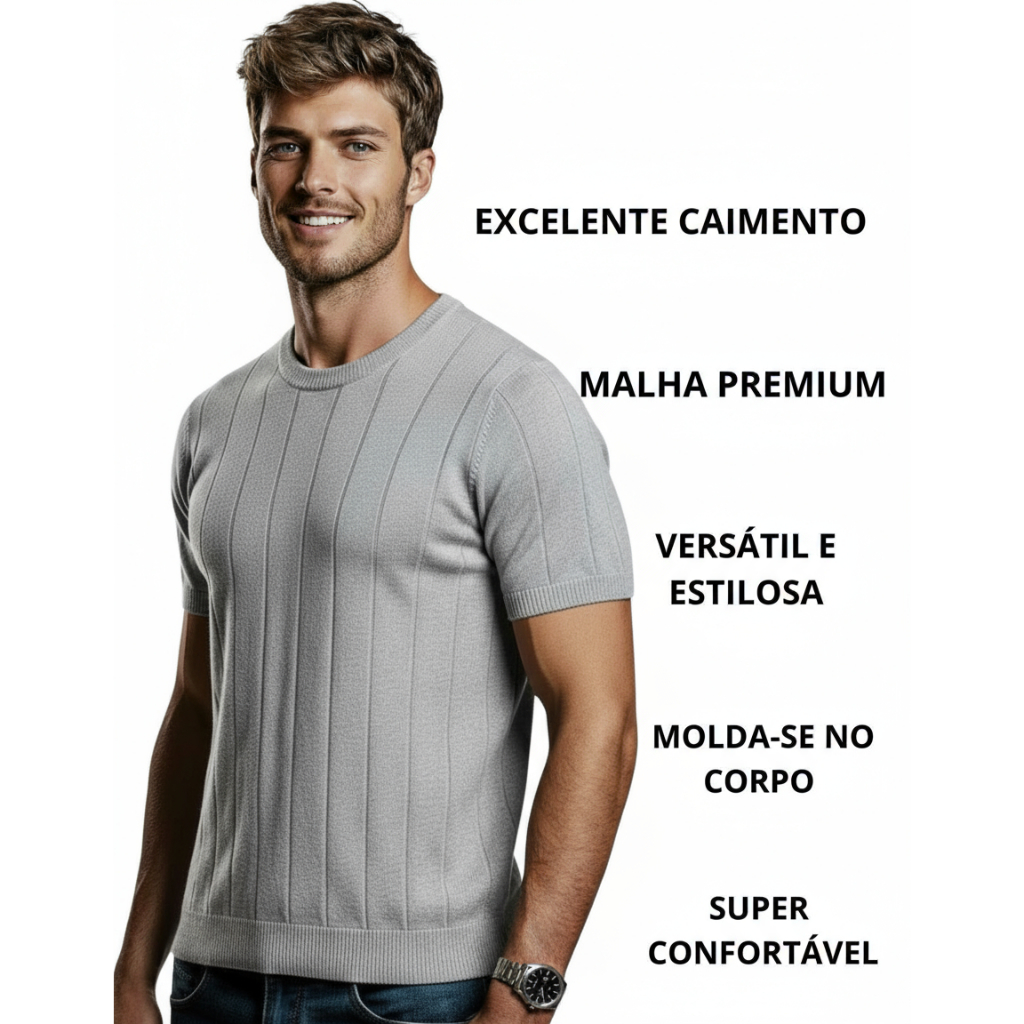 Camisa Slim Masculina Malha Canelada Tipo Algodão Linho Gola Redonda Tricot
