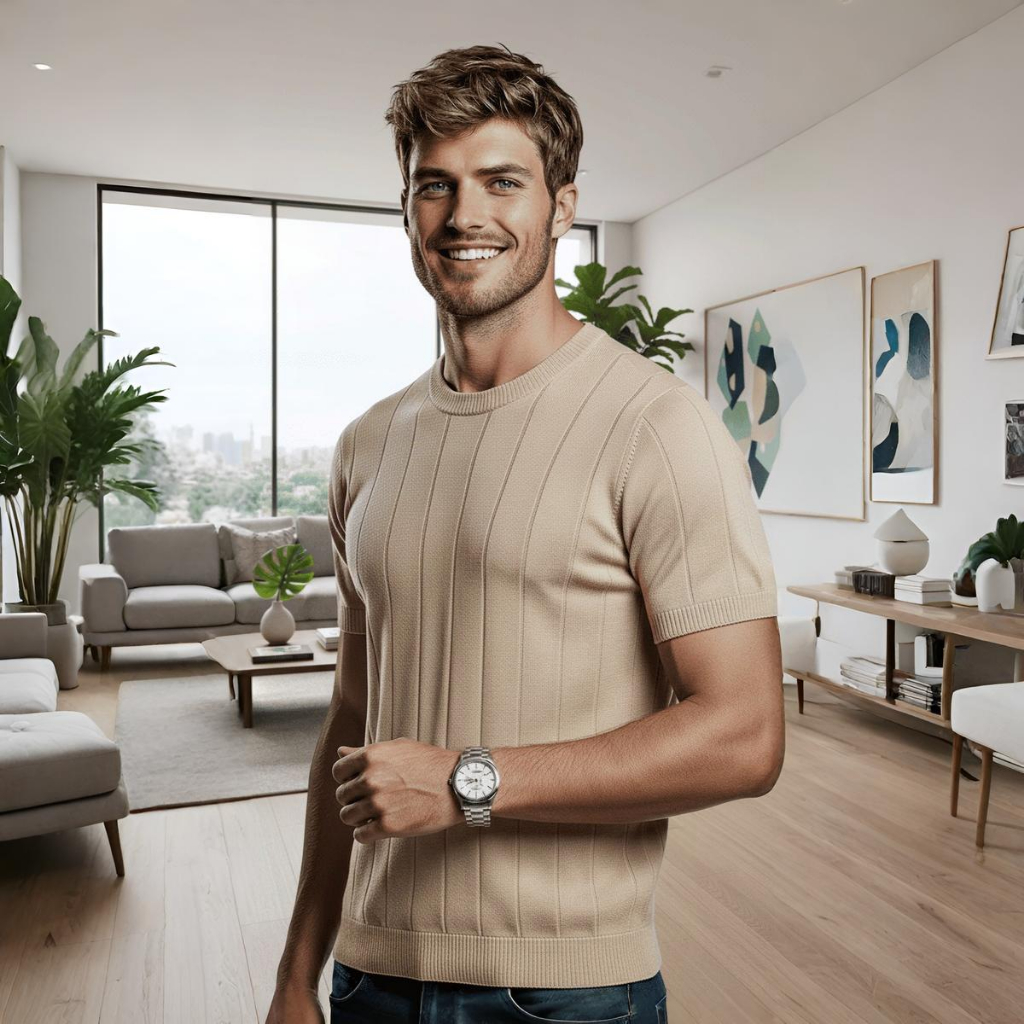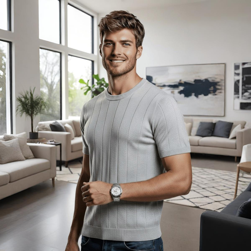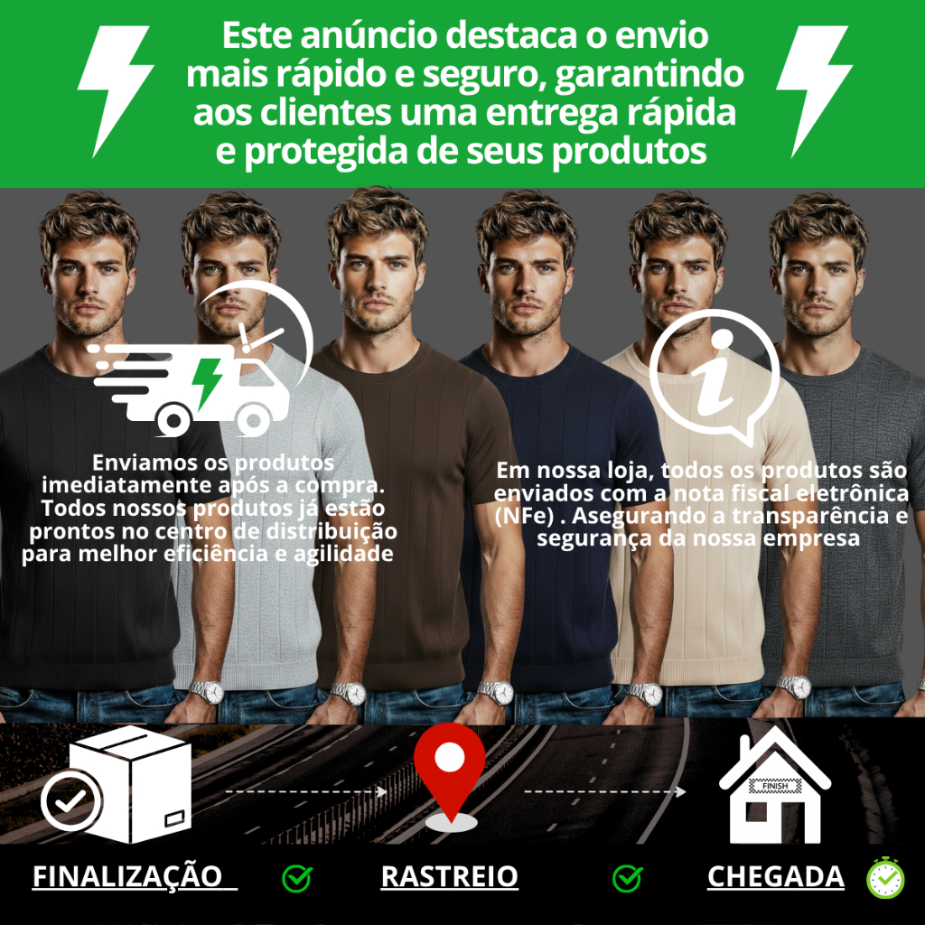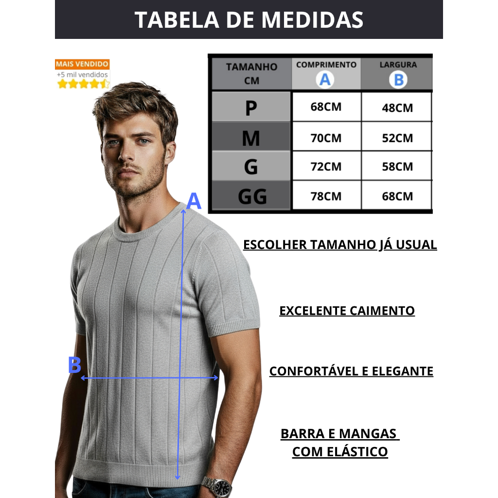 Camisa Slim Masculina Malha Canelada Tipo Algodão Linho Gola Redonda Tricot