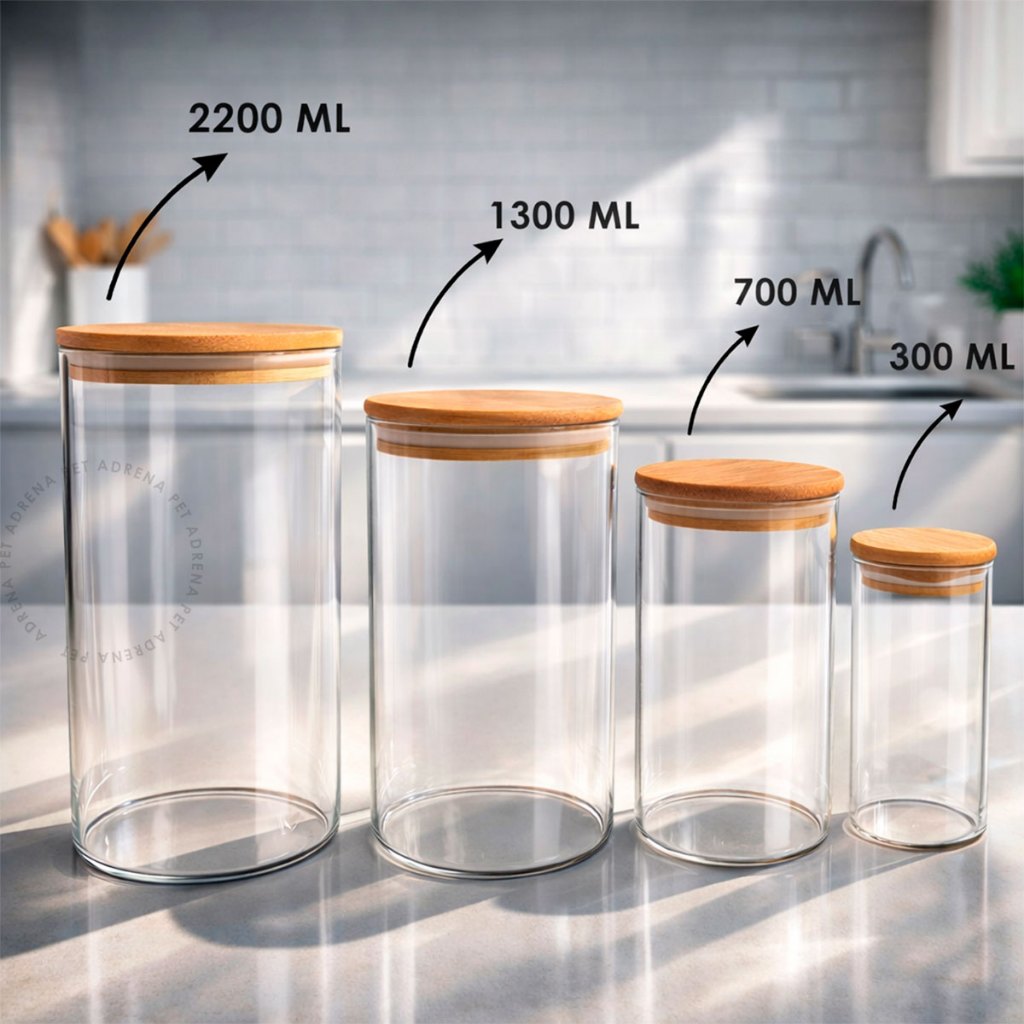 Kit 4 Potes de Vidro Hermético com Tampa de Bambu Temperos e Alimentos Redondos