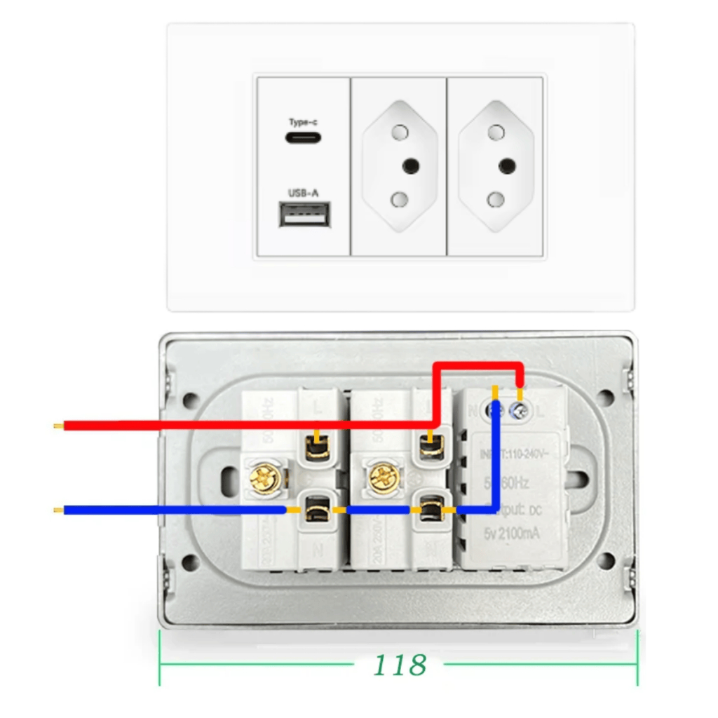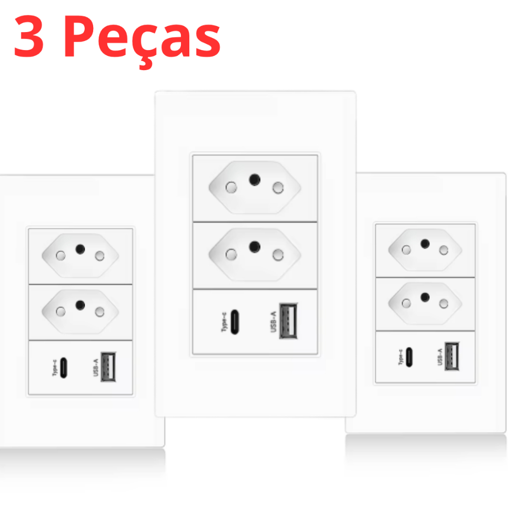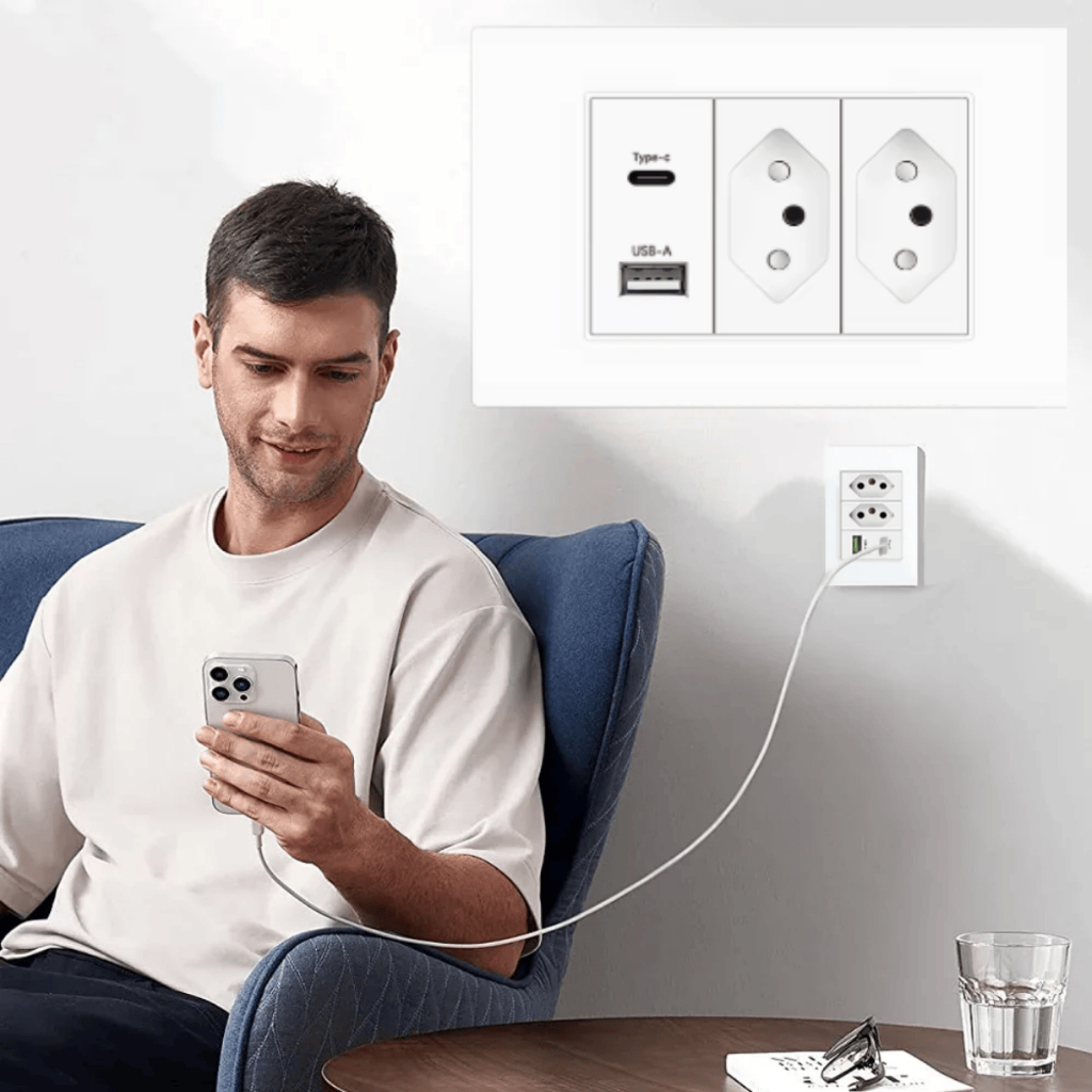 Tomada de Parede Dupla Com Entrada Usb e tipo C 5V Bivolt 4/1 Carregamento Rápido Multi Carregamento