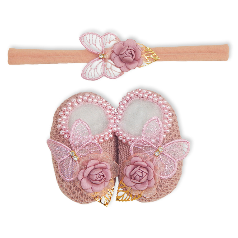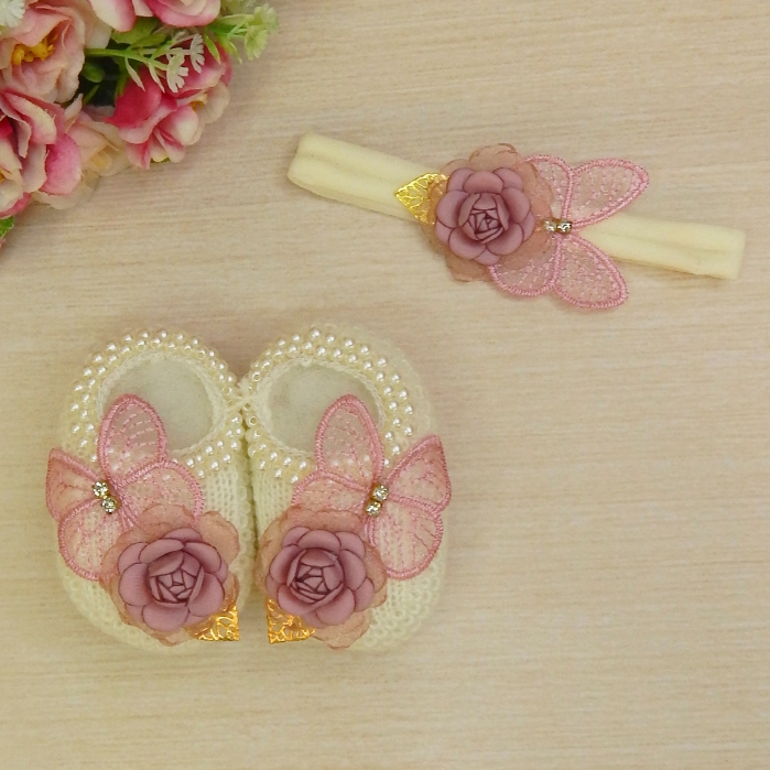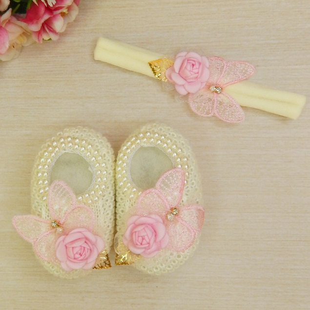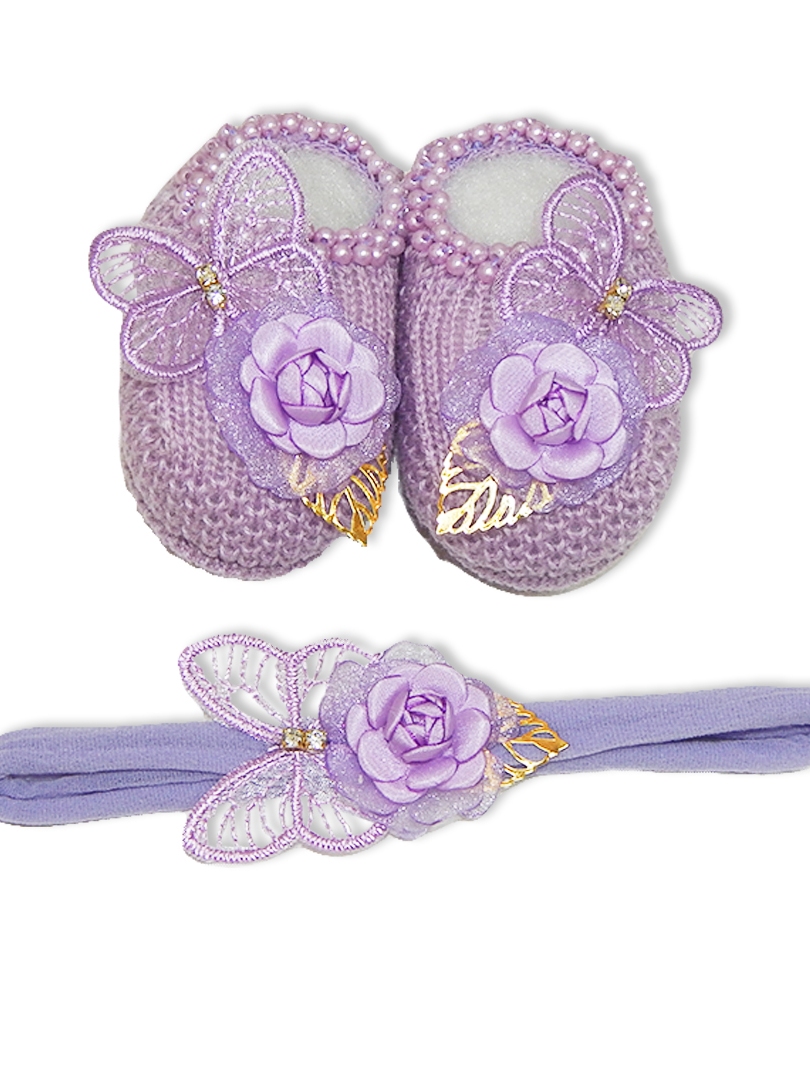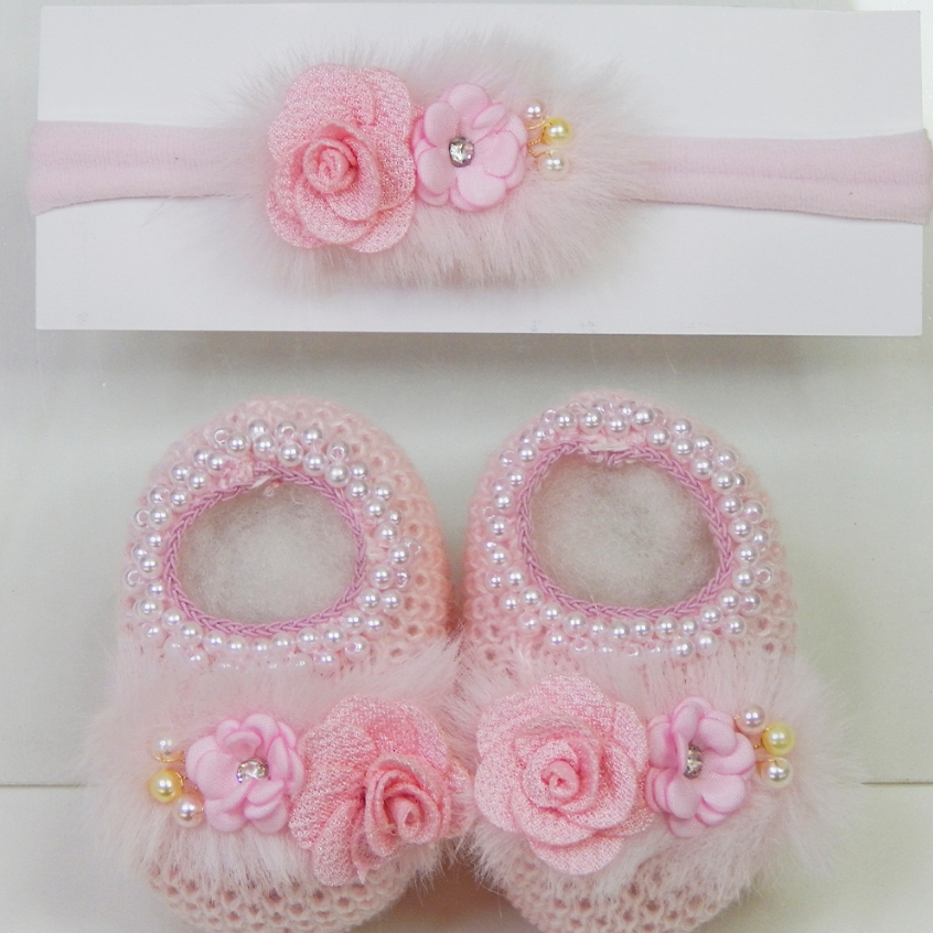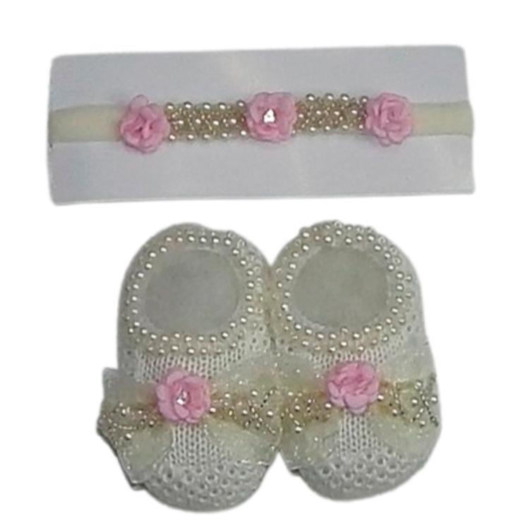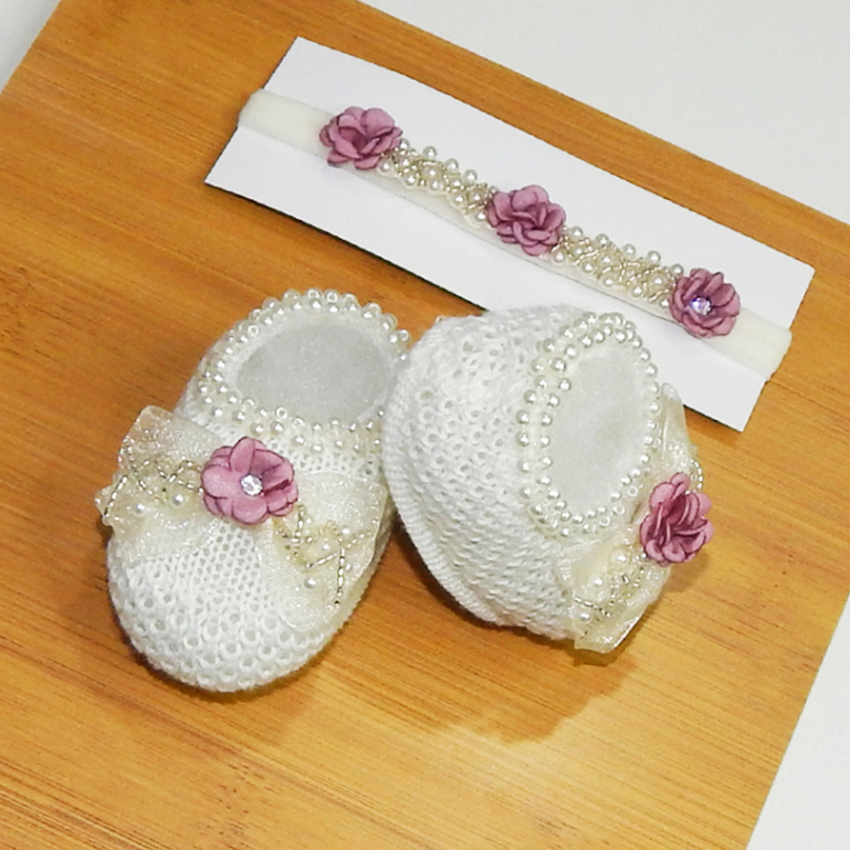 Sapatinho Tricô Bebê com Faixa de Cabelo Laço