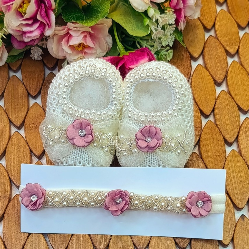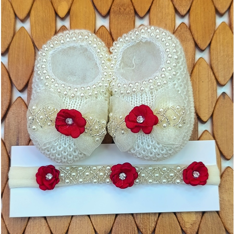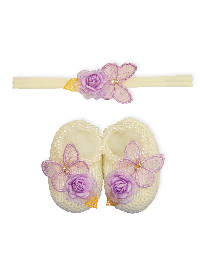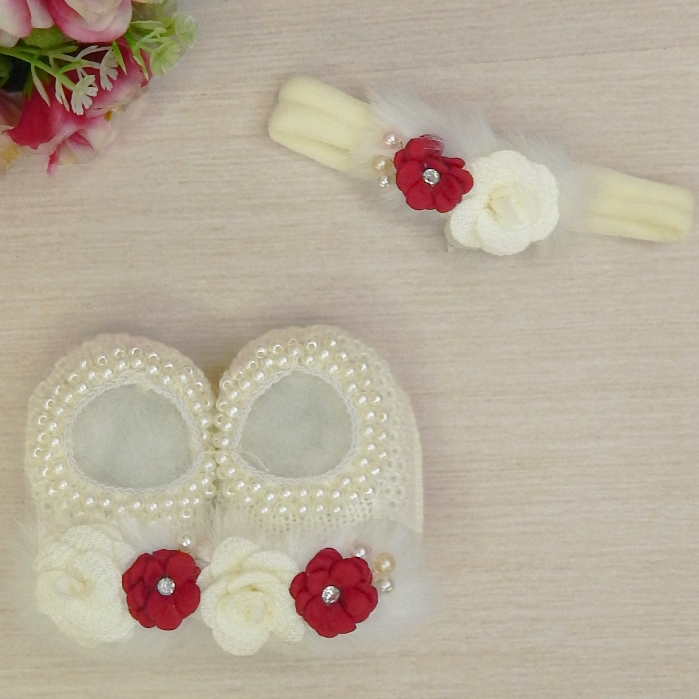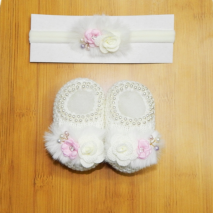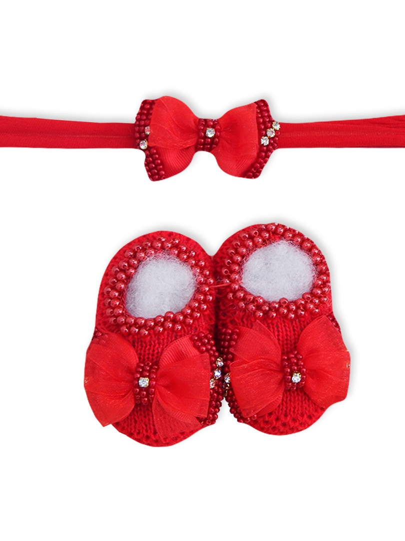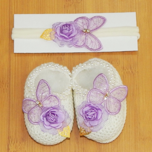 Sapatinho Tricô Bebê com Faixa de Cabelo Laço