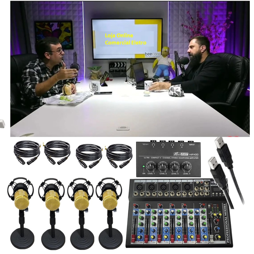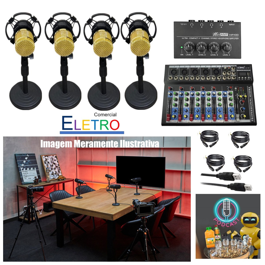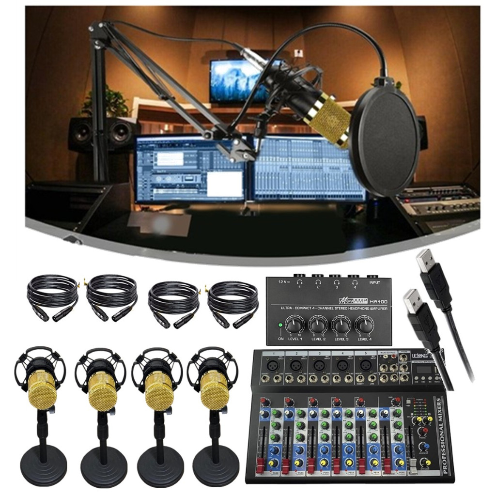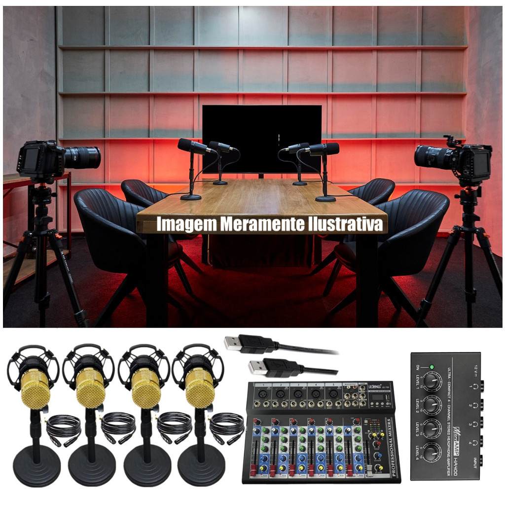 Novo Sistema de Audio Para Podcaster Mixer Mesa Interface USB C/ 4 Microfones Studio Condensador
