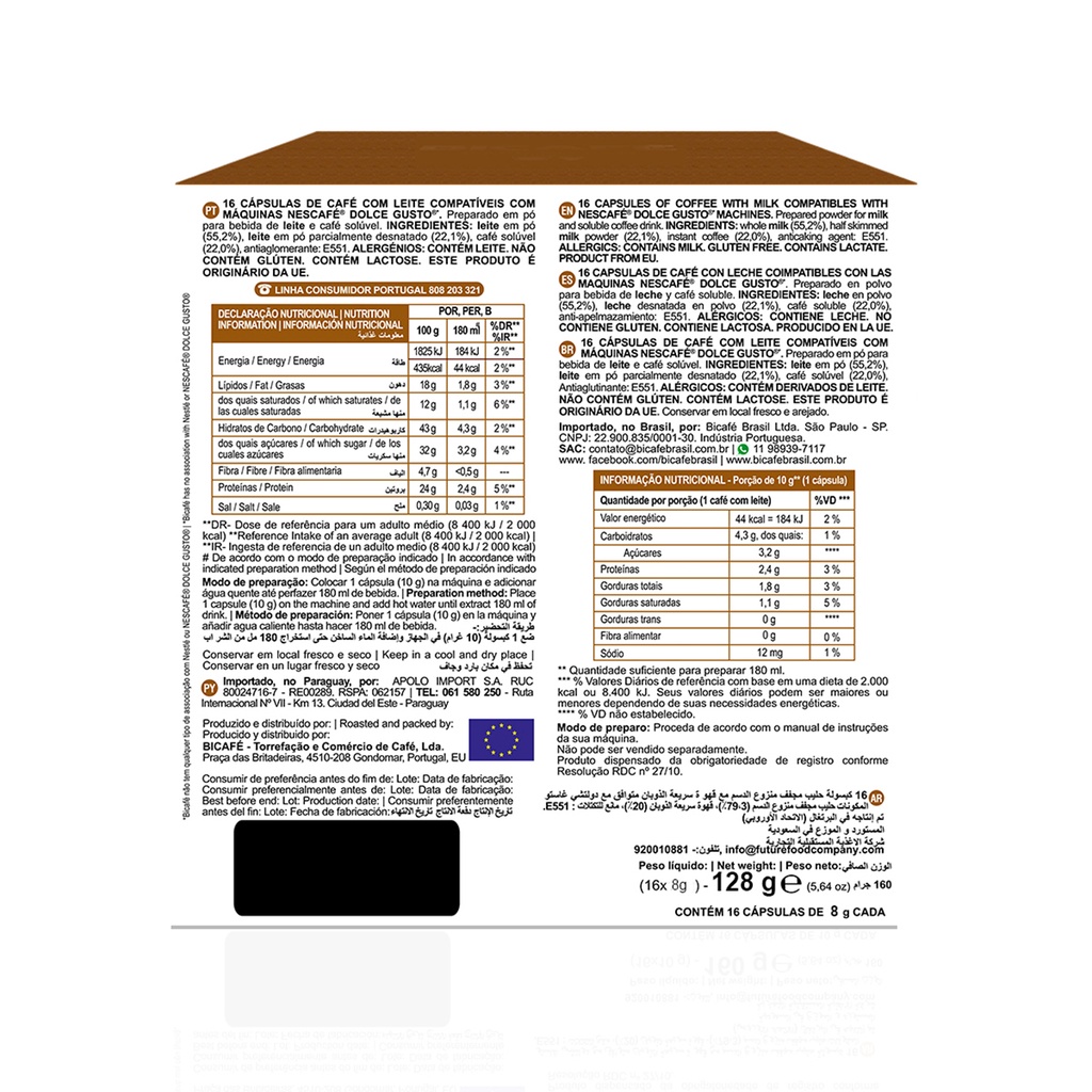 Cápsula De Café Com Leite Sem Açúcar Bicafé P/ Máquinas Dolce Gusto*