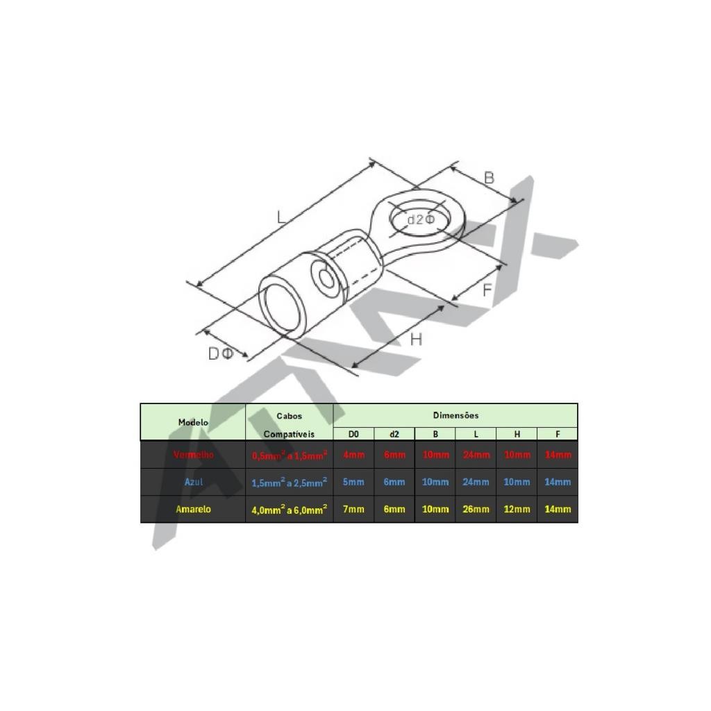 Kit 100 peças terminal Olhal Pré-isolado Azul 1,5mm A 2,5mm M6