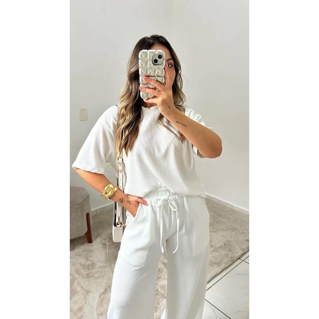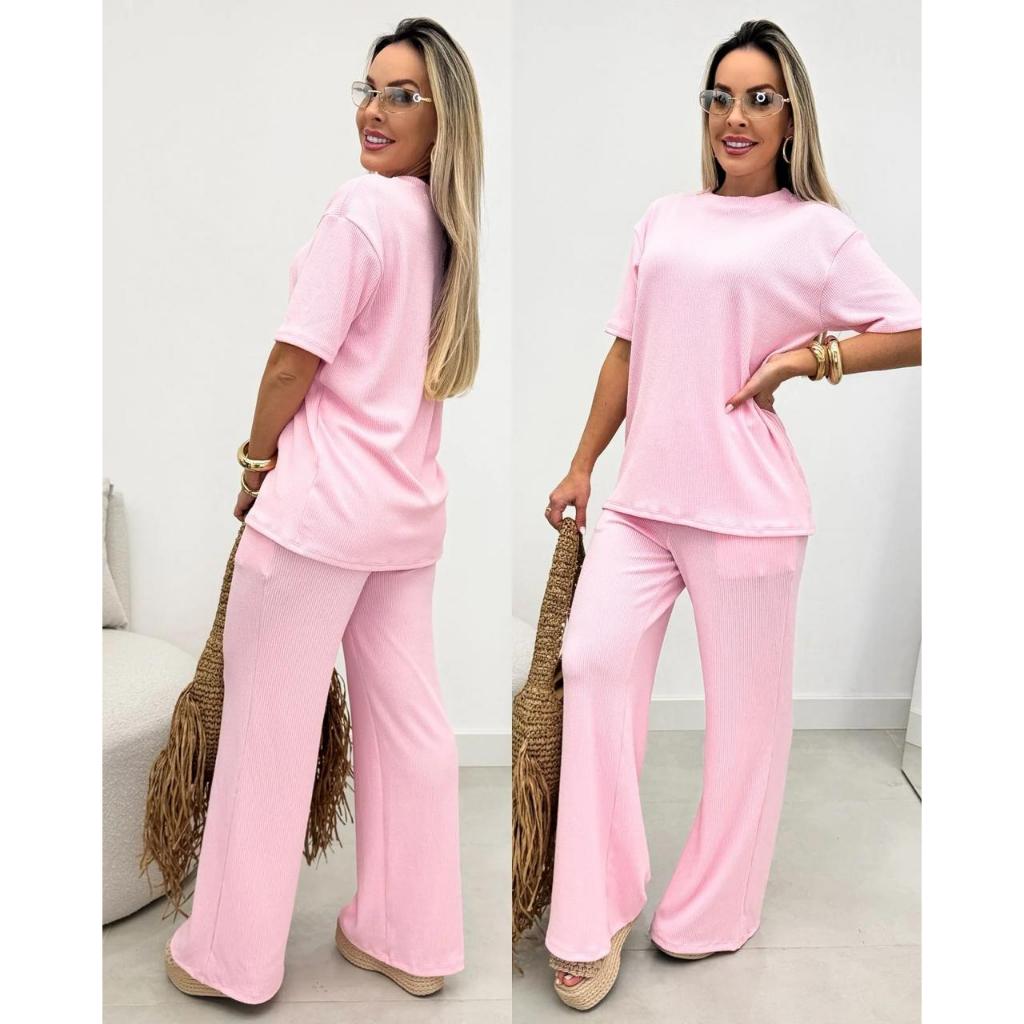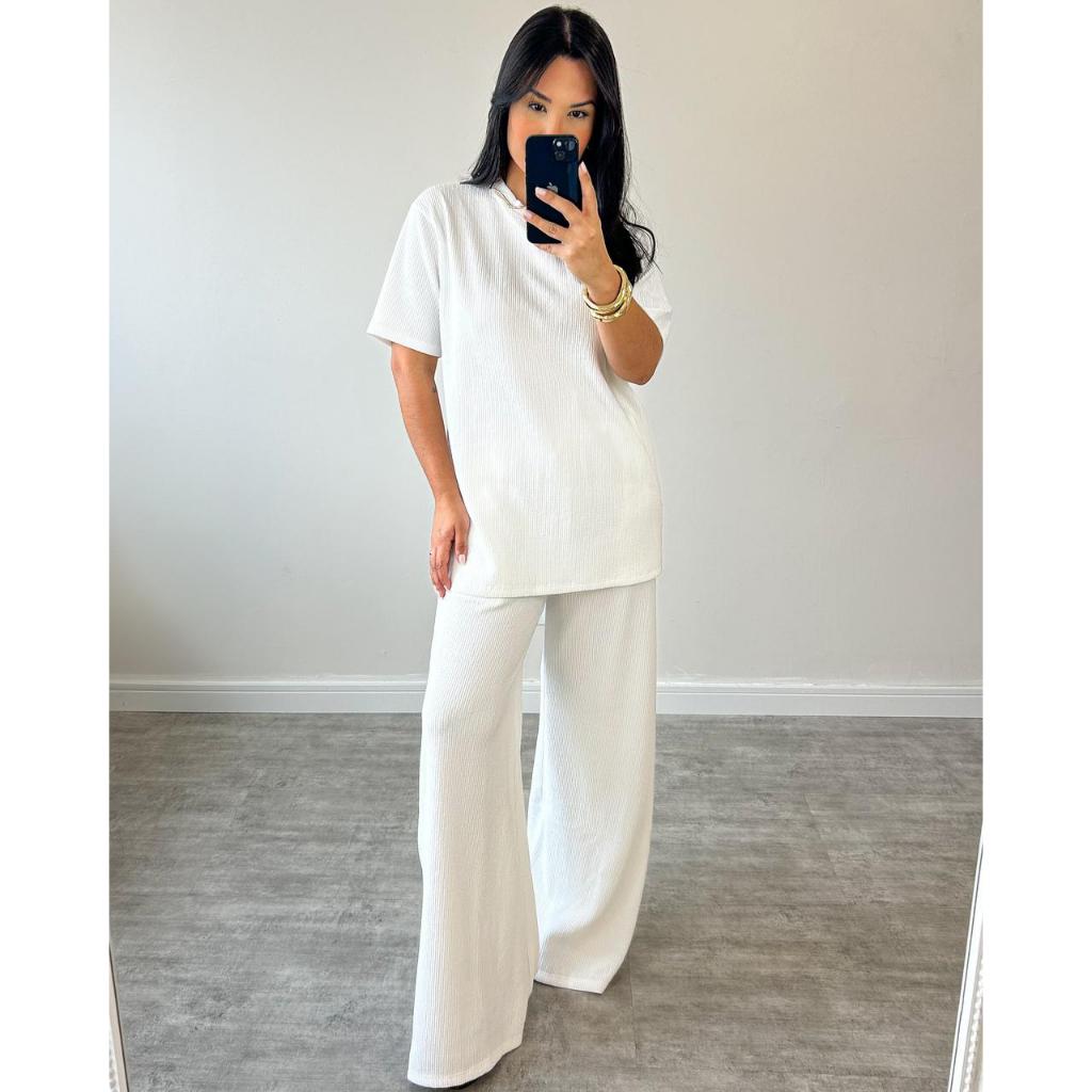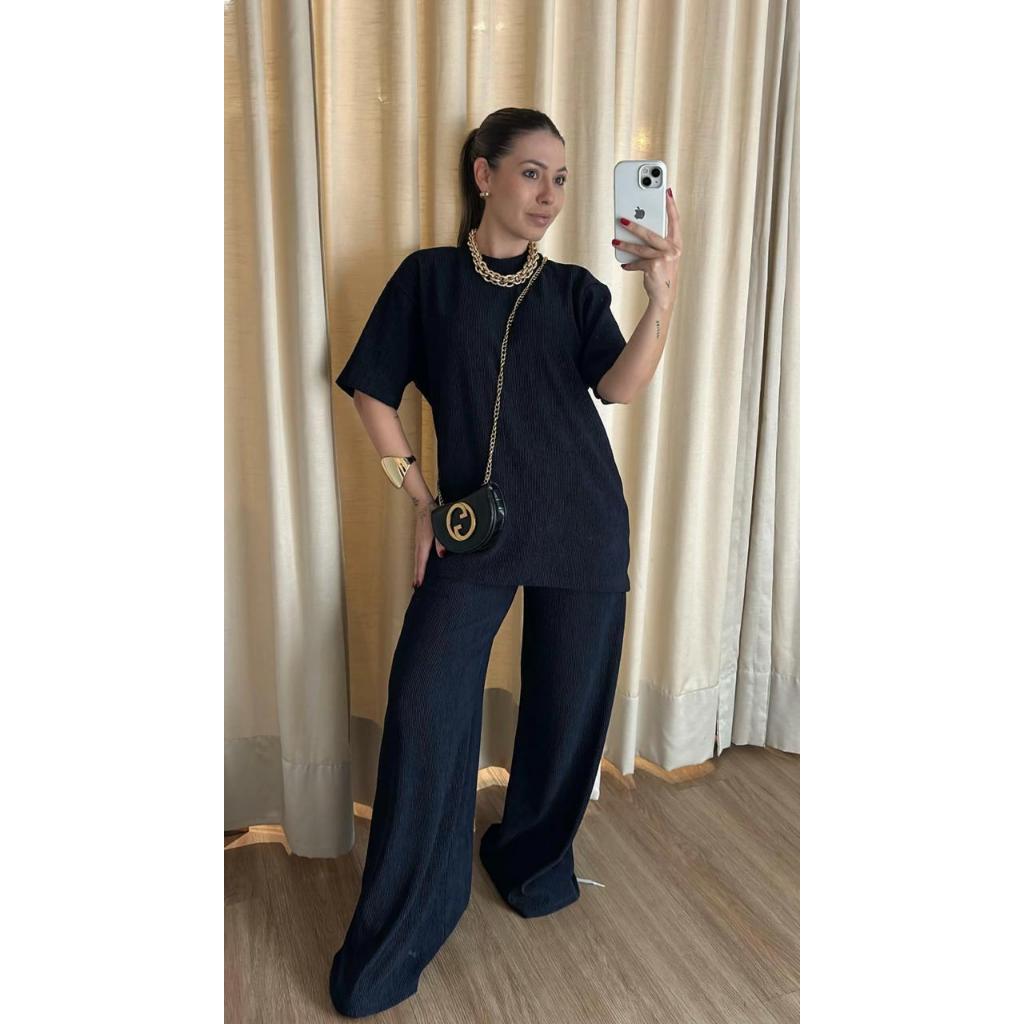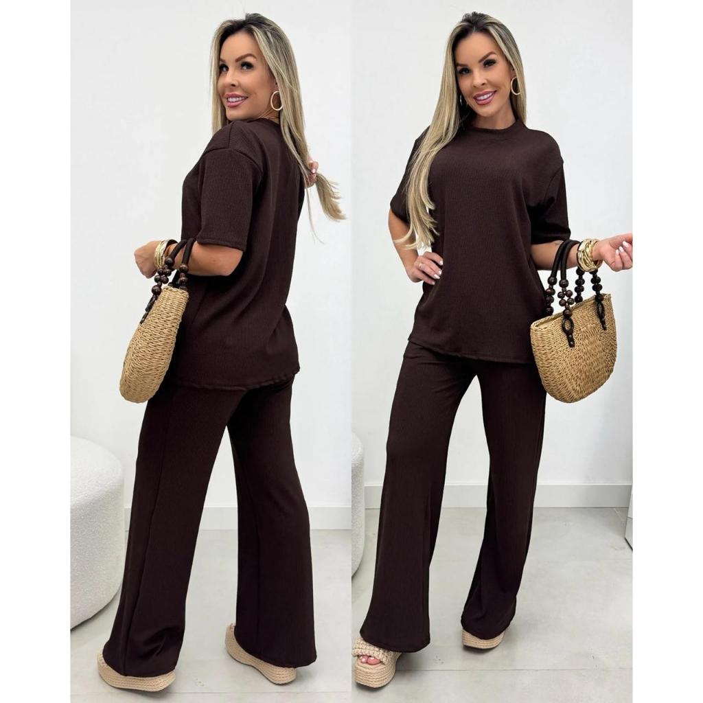 conjunto feminino oversize ana ruga calça pantalona camiseta longa manga curta trico confortavel chic elegante dia a dia