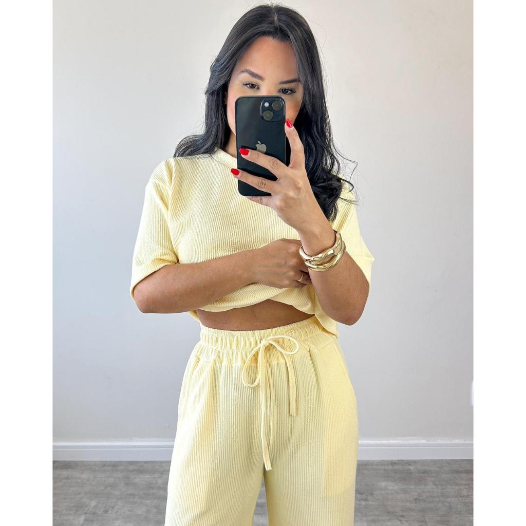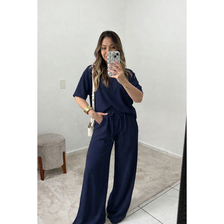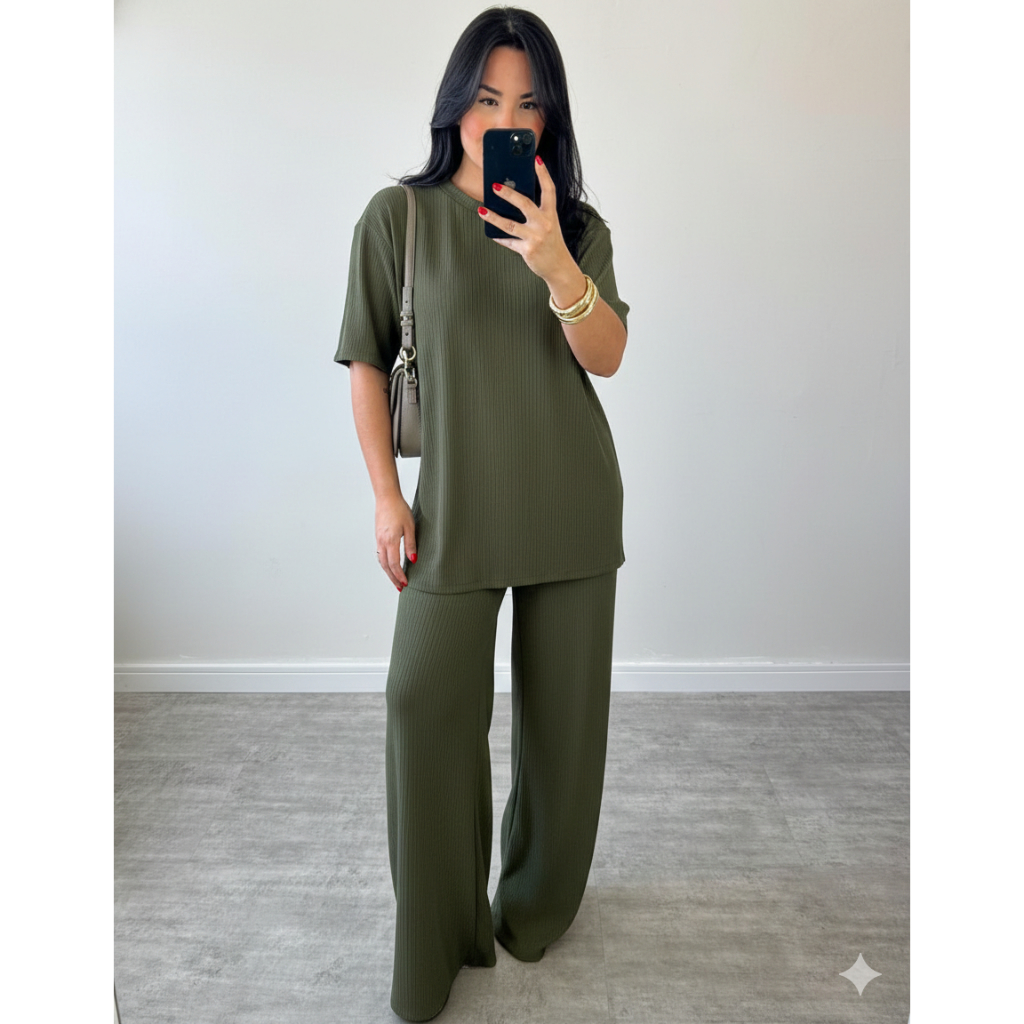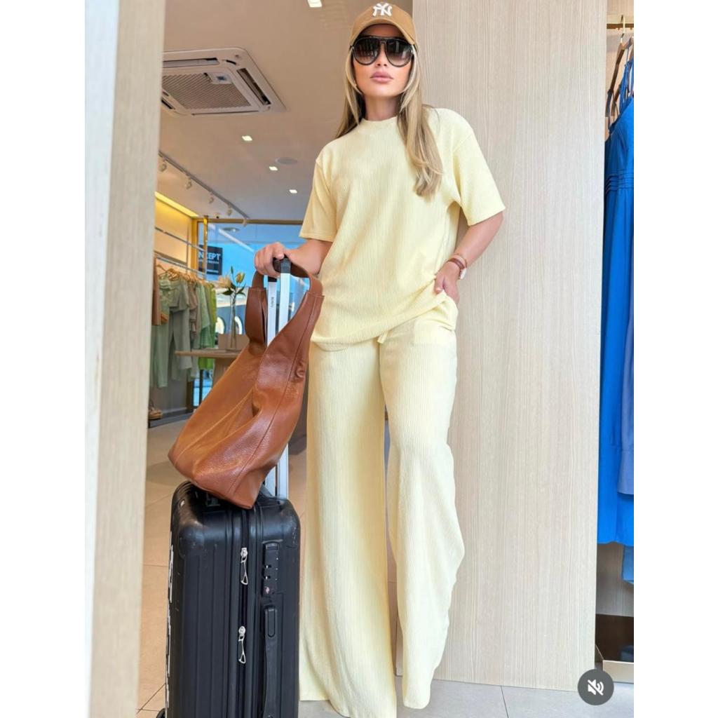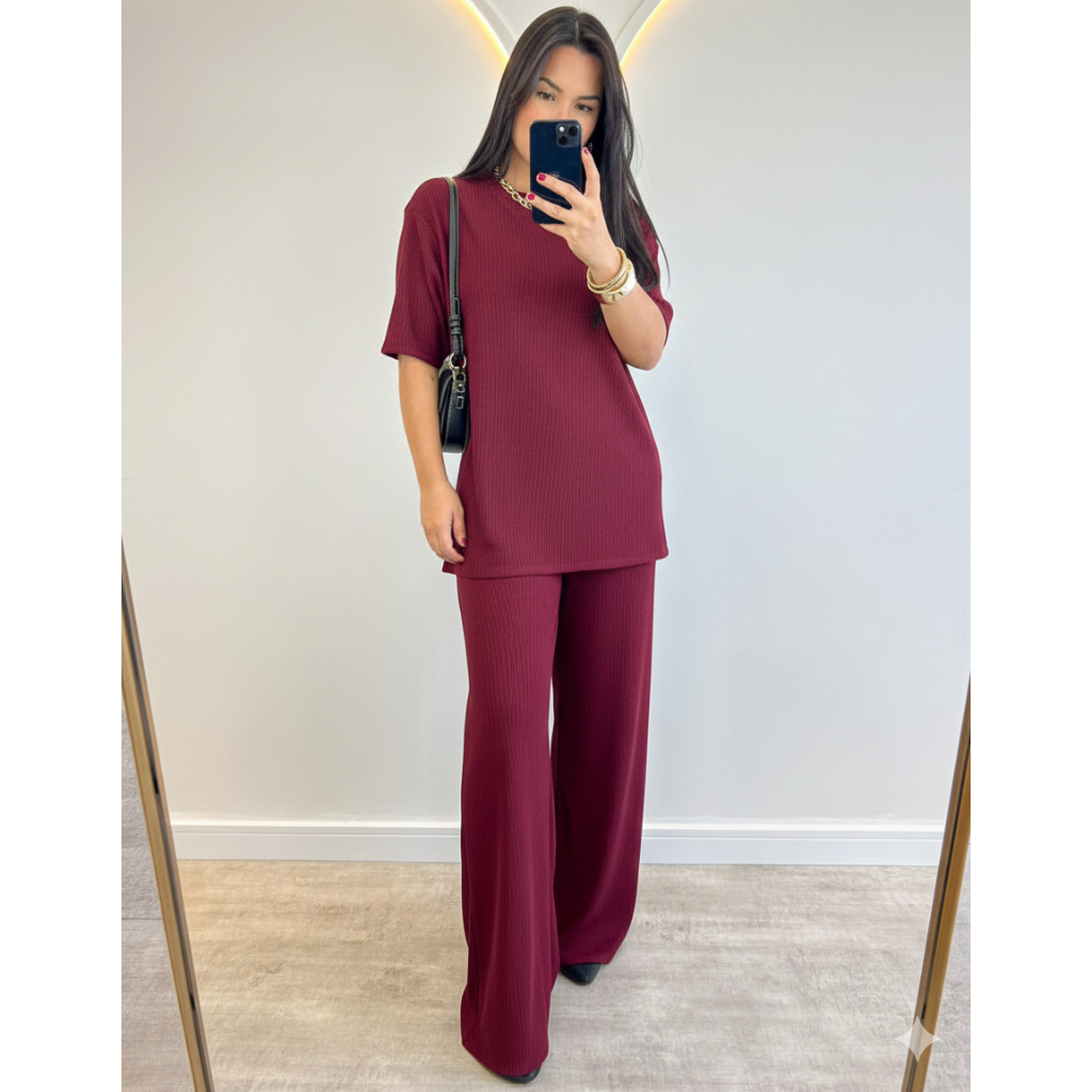 conjunto feminino oversize ana ruga calça pantalona camiseta longa manga curta trico confortavel chic elegante dia a dia
