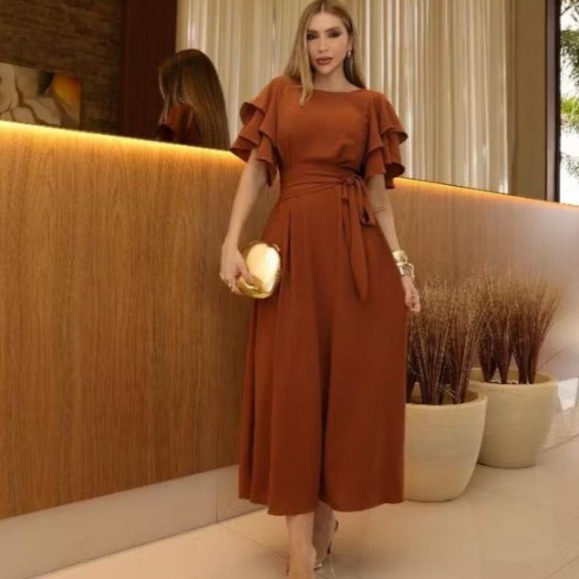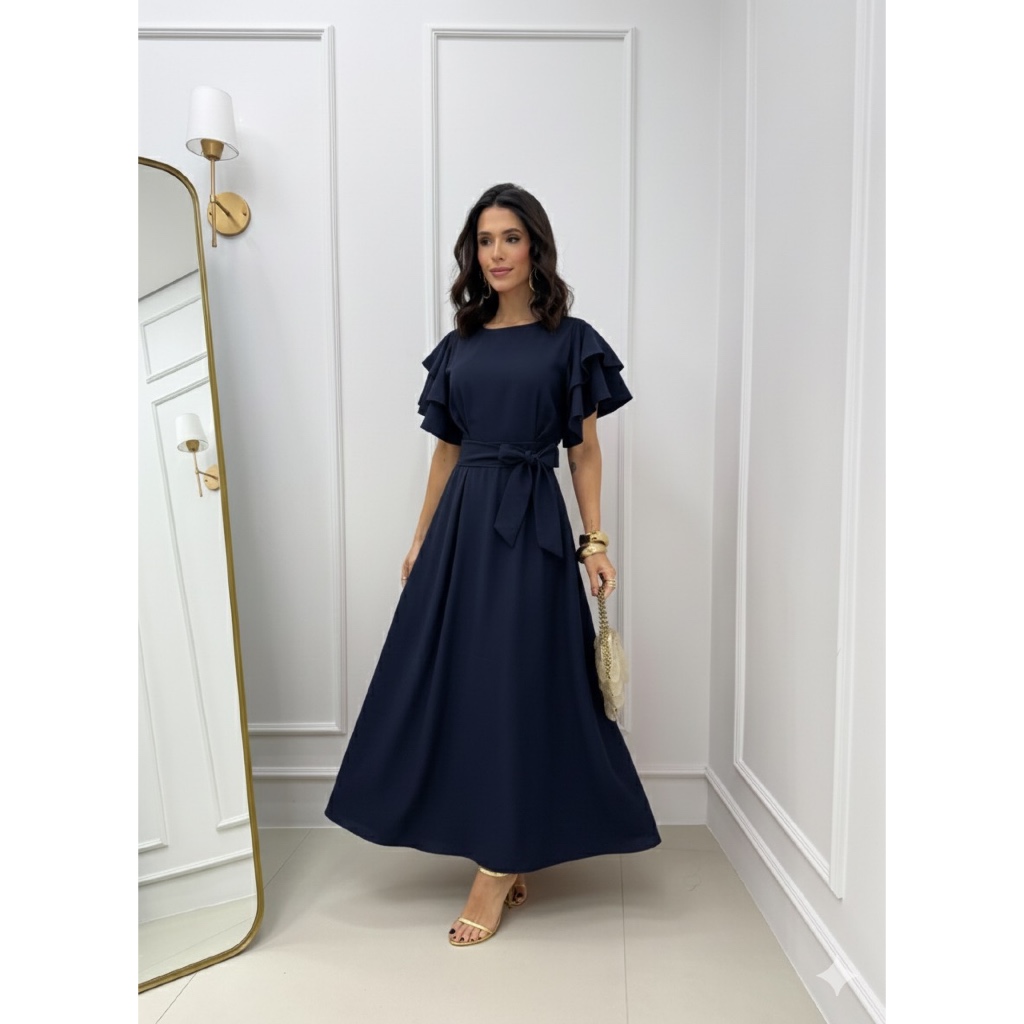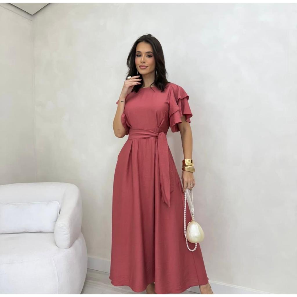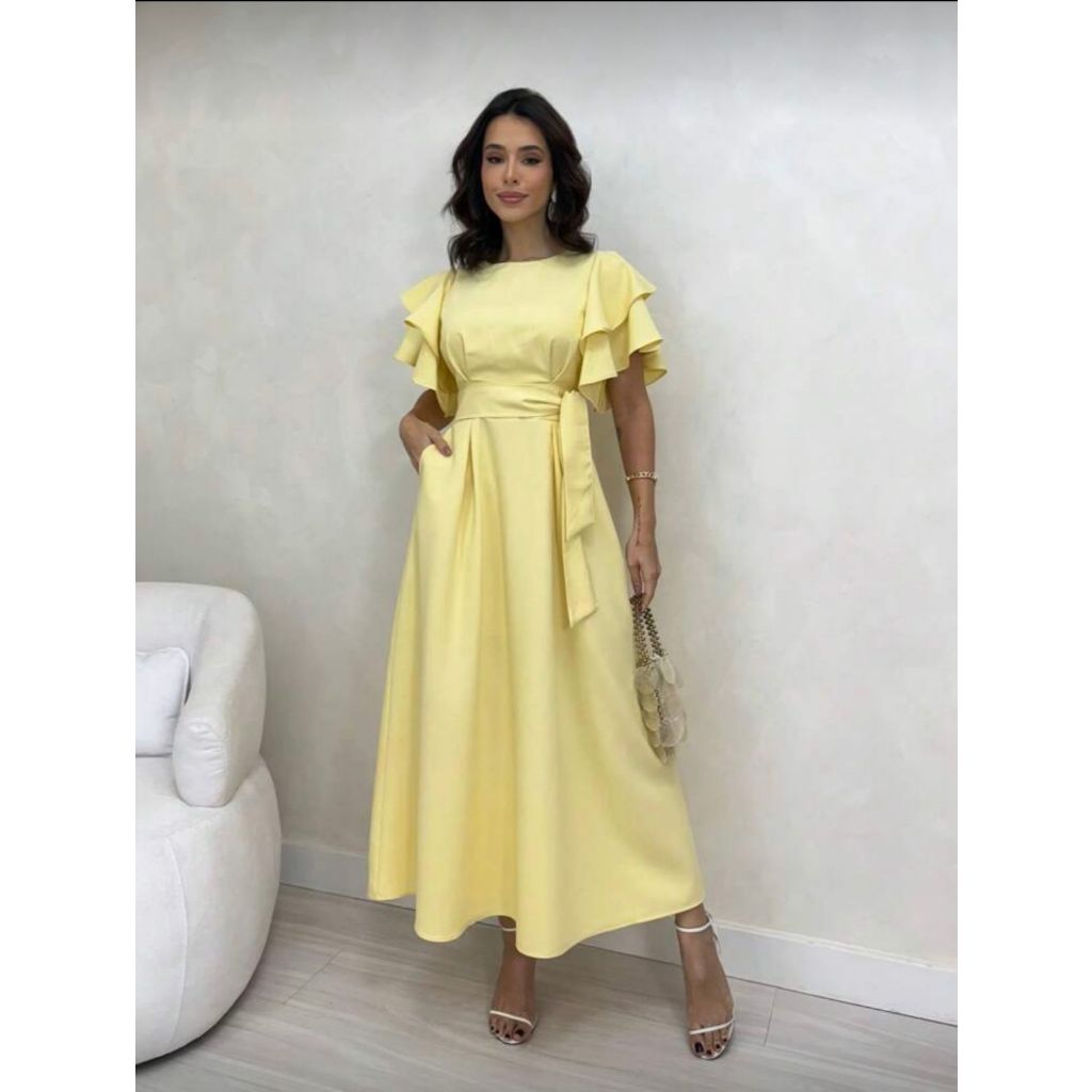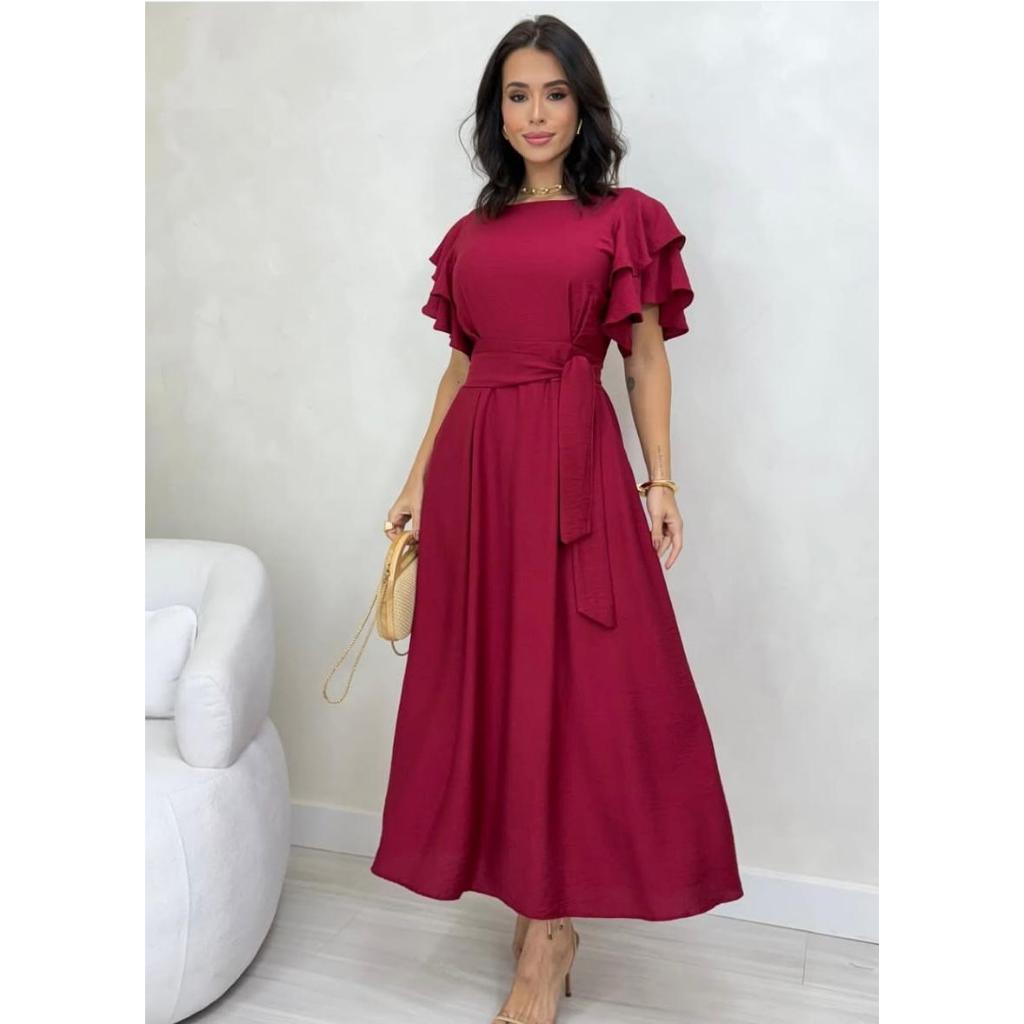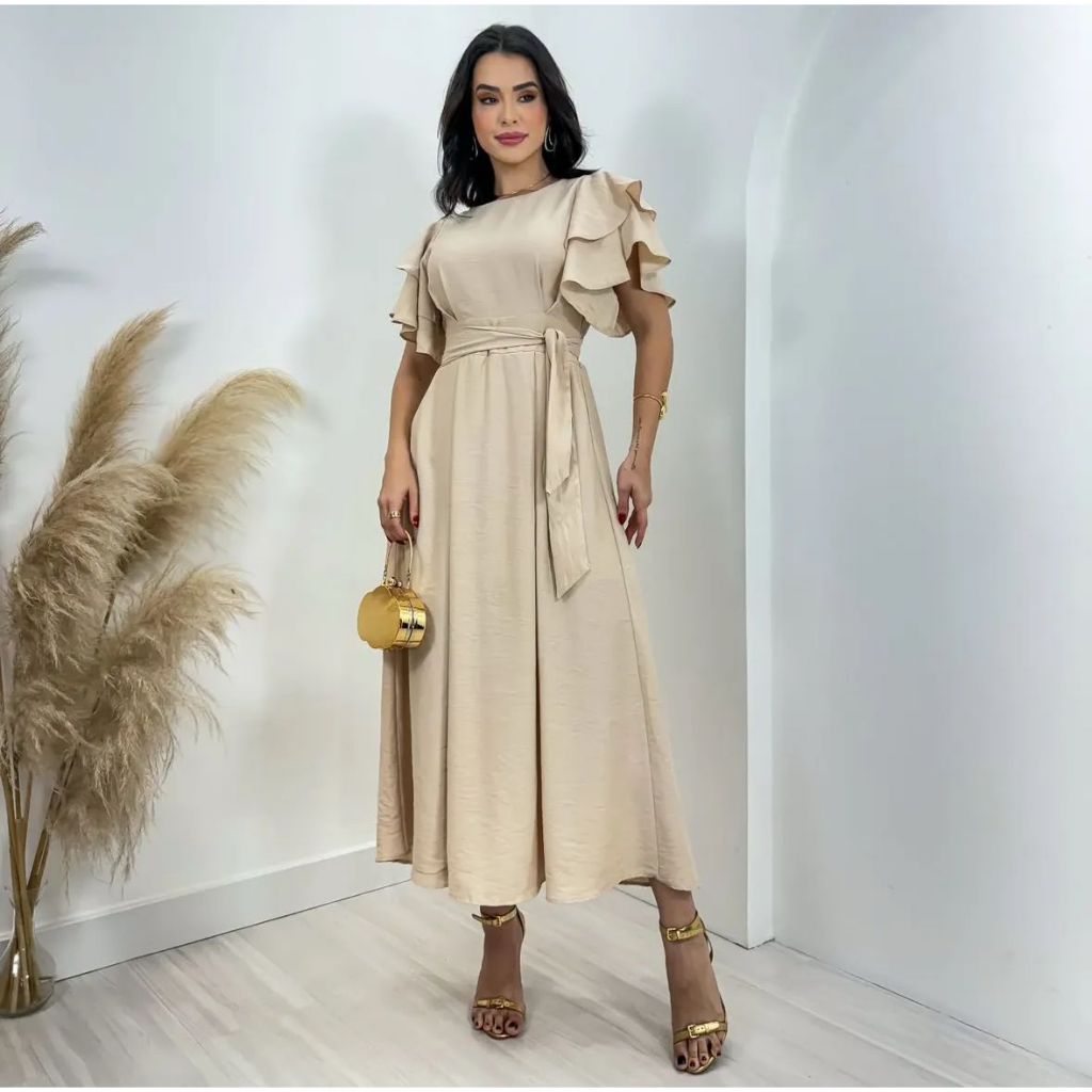 vestido longo manga bufante princesa midi babado com cinto moda elegante evangelica