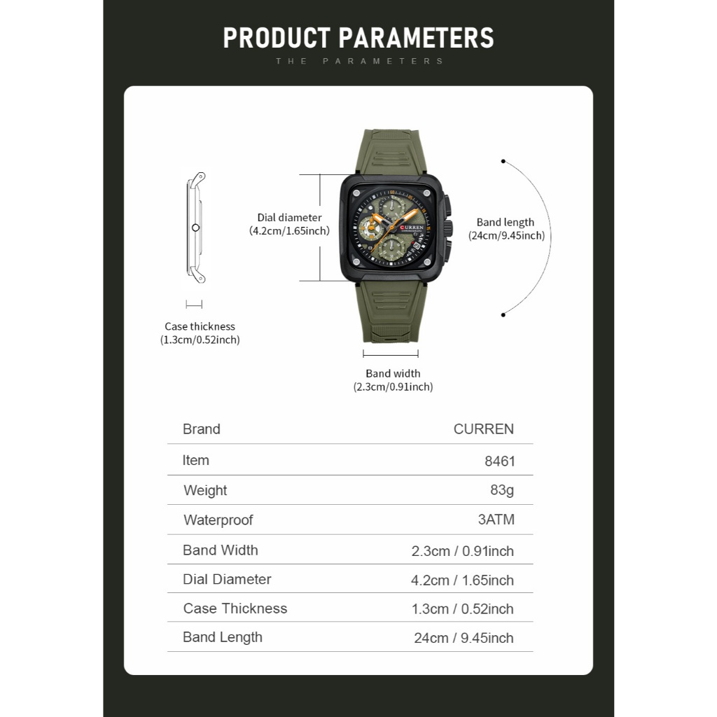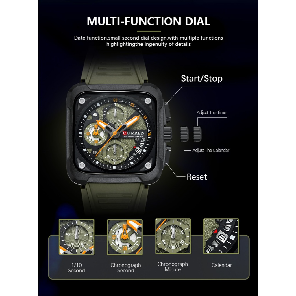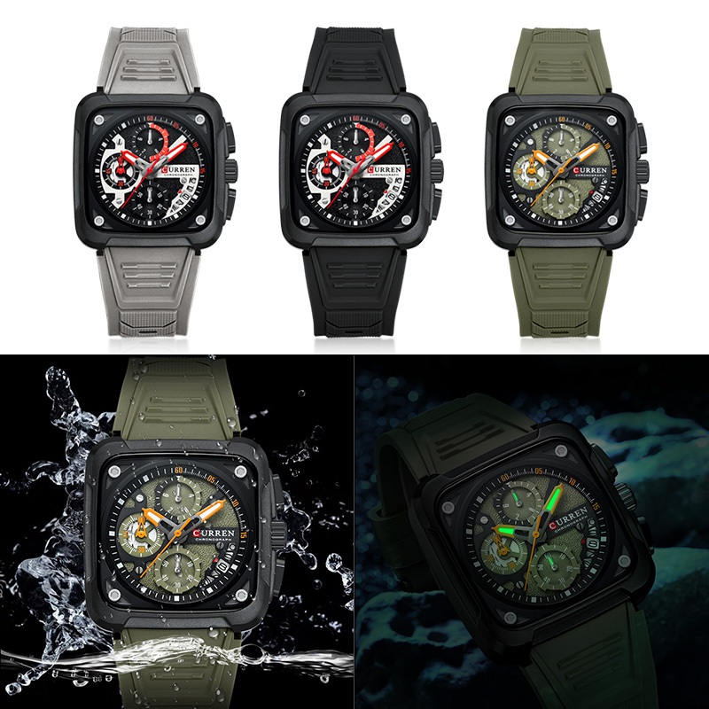 CURREN Marca Original Genuína Multifuncional Quadrado Cronógrafo Calendário Luminoso Pulseira De Silicone Casual Negócio