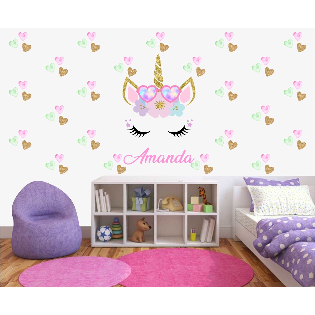 Adesivo Decorativo Parede Rosto Unicornio Glitter (MAIOR com 70 cm) + 110 Corações Nome Óculos