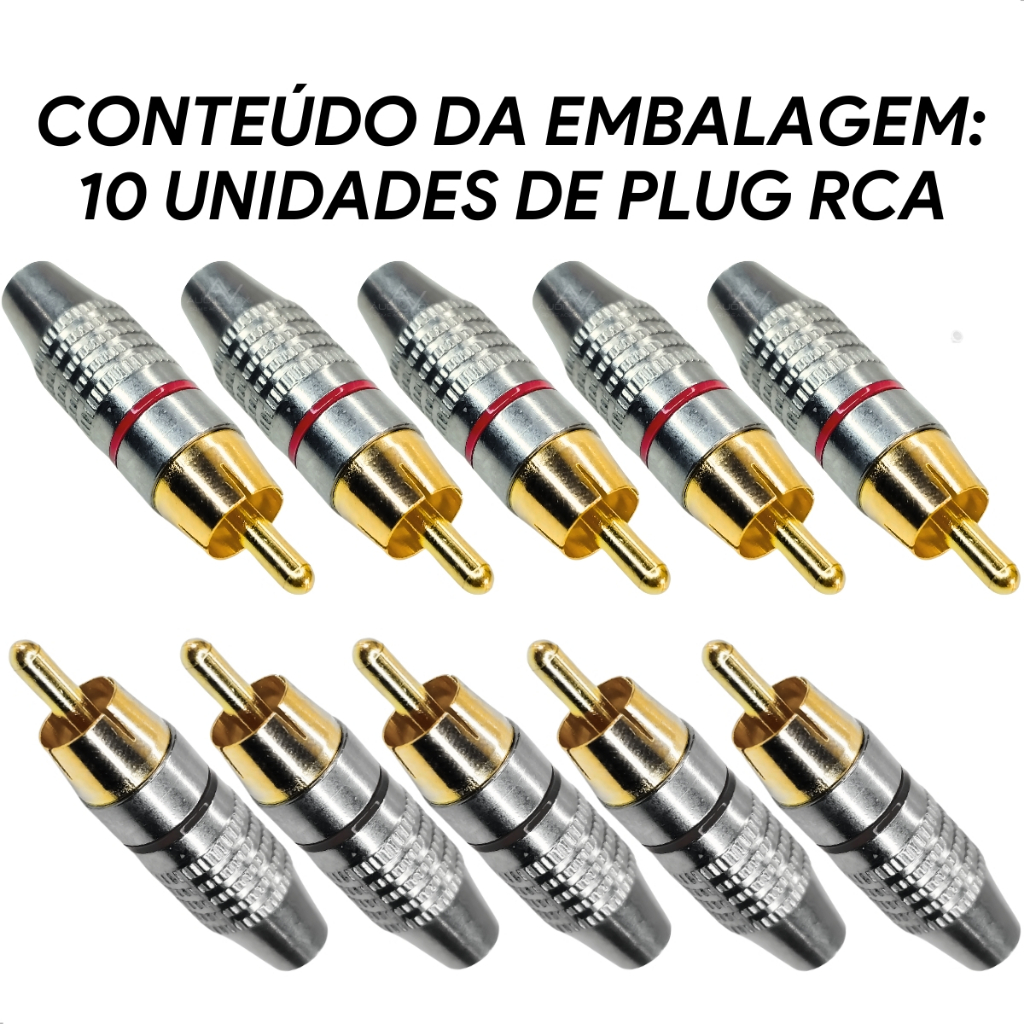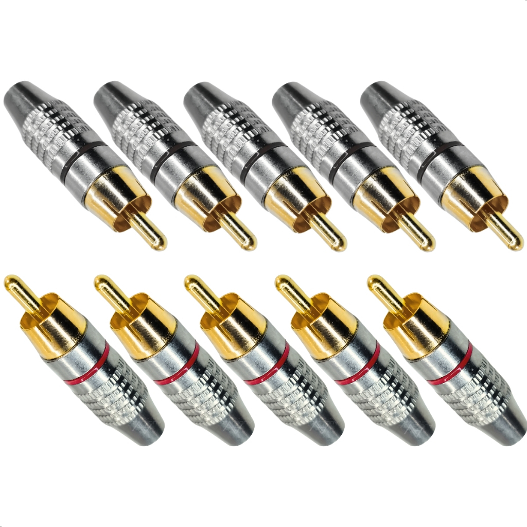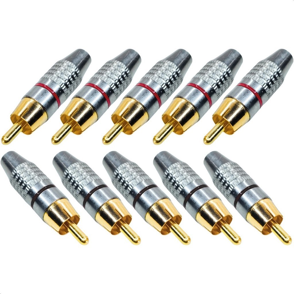 Kit 10 Unidades Plug Rca Macho Metal Niquelado Ponta Dourada Alta Qualidade Dourado Para Fio Cabo