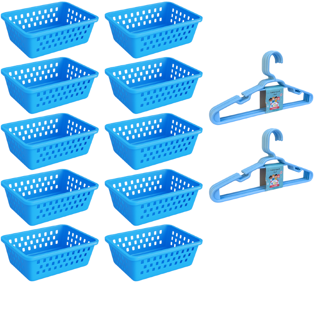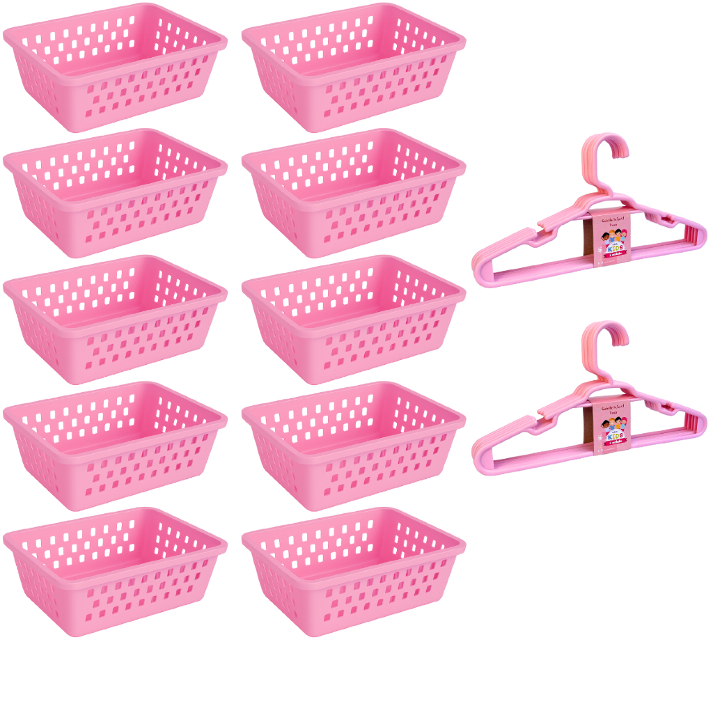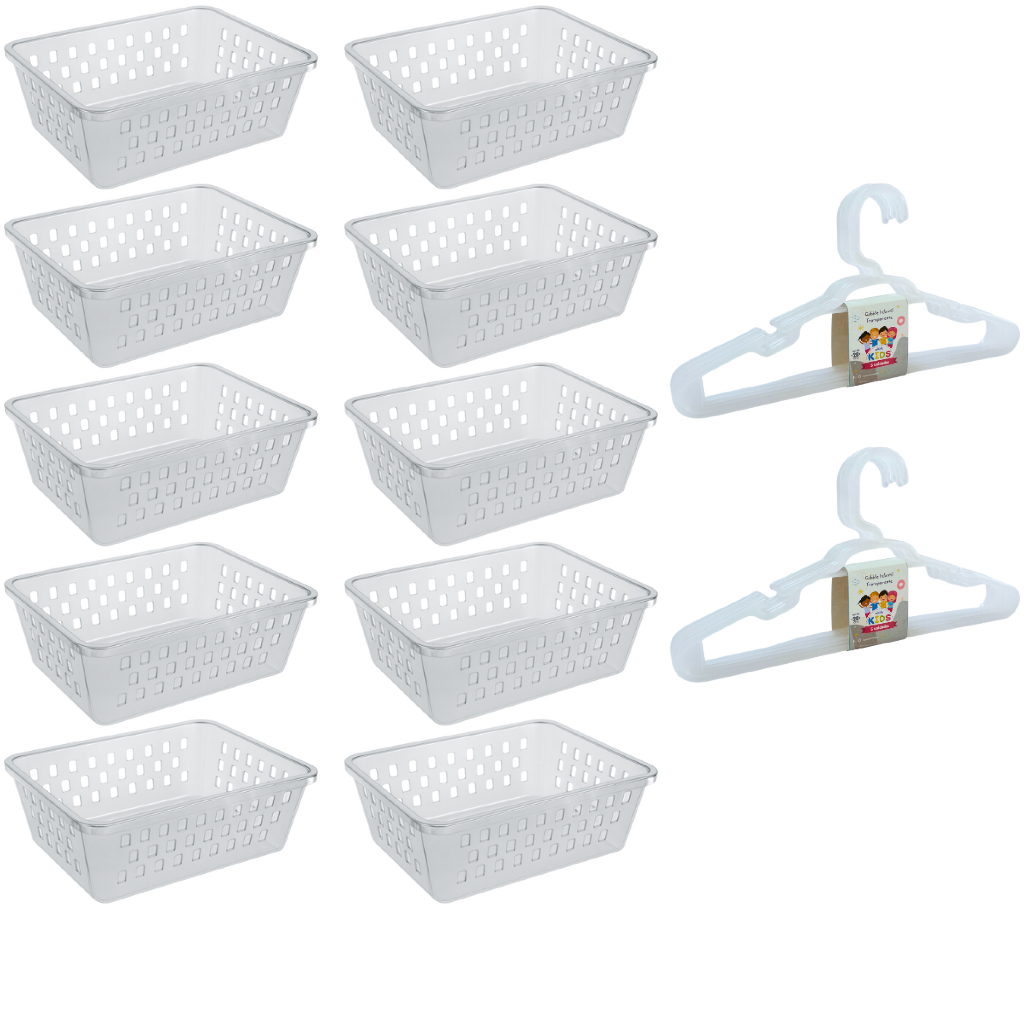 Kit 10 Cesto Organizador e 10 Cabide Infantil Branco Transparente Rosa Azul