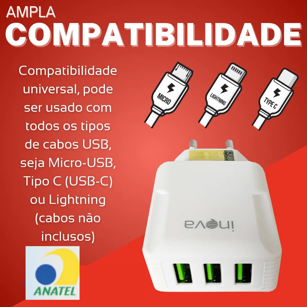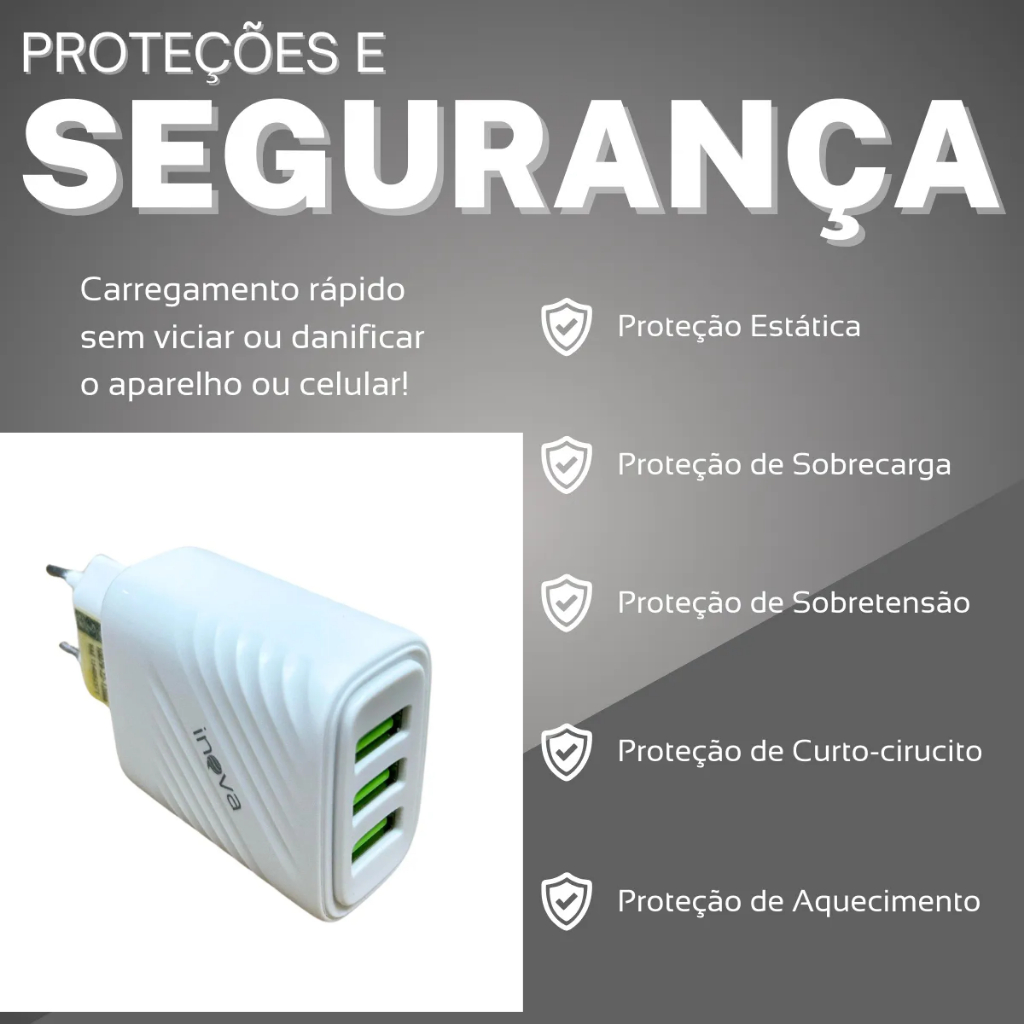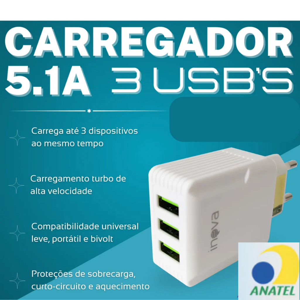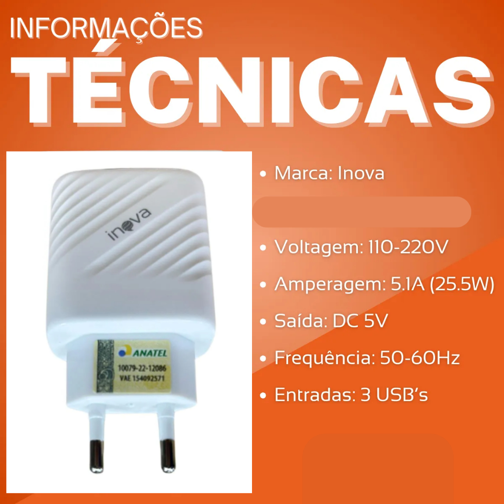 Carregador Triplo Rápido 5.1 Amperes 25.5 Watts 3 USB Saídas