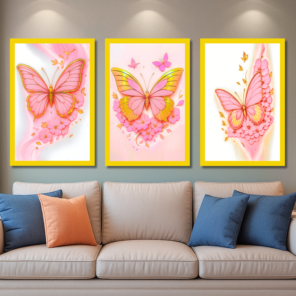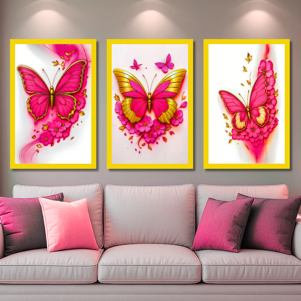 Quadros decorativos Borboletas Douradas Flores Sala Copa Área Sem Moldura Decoração Enfeitar 3 peças