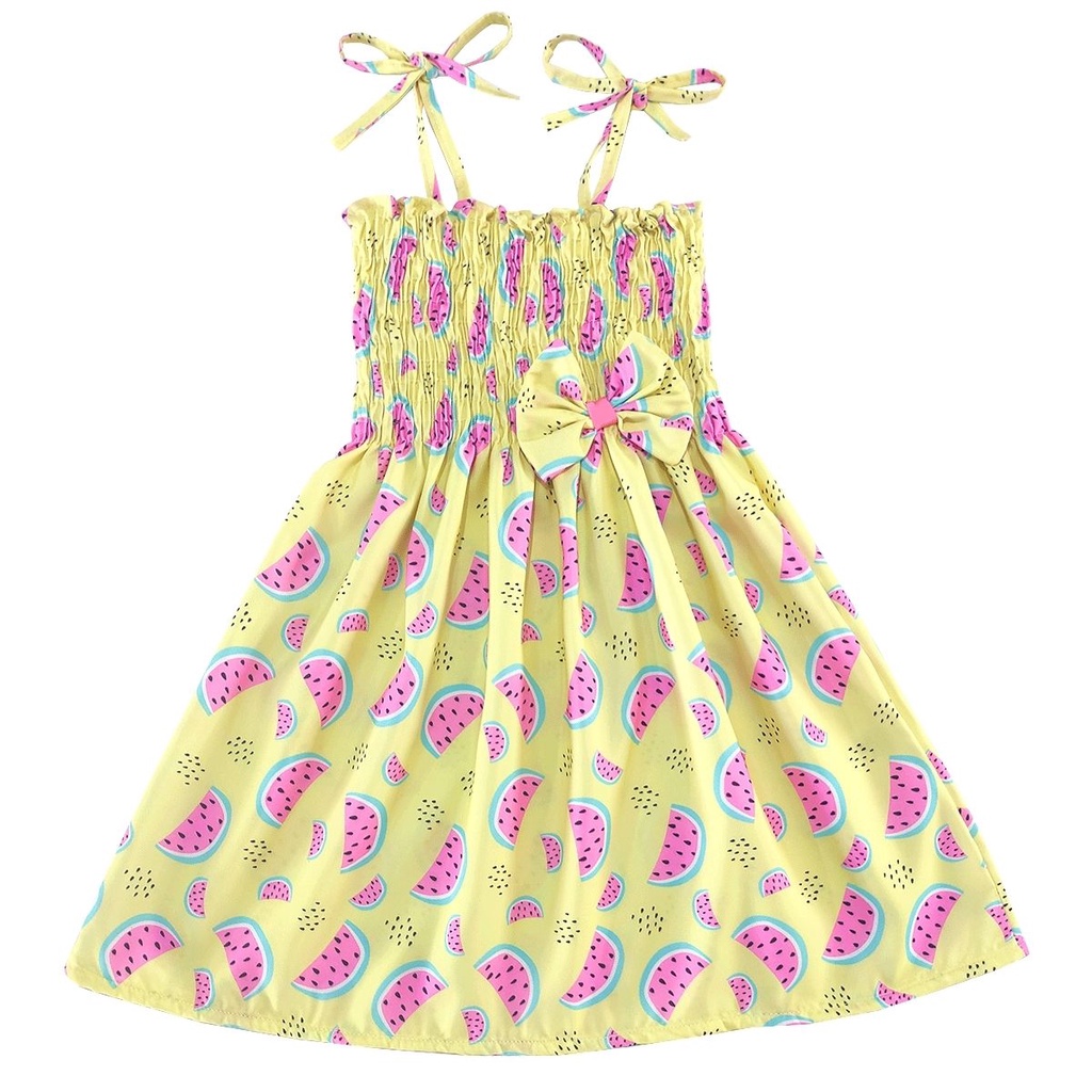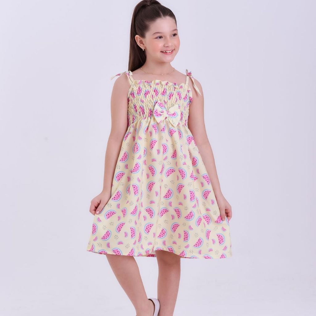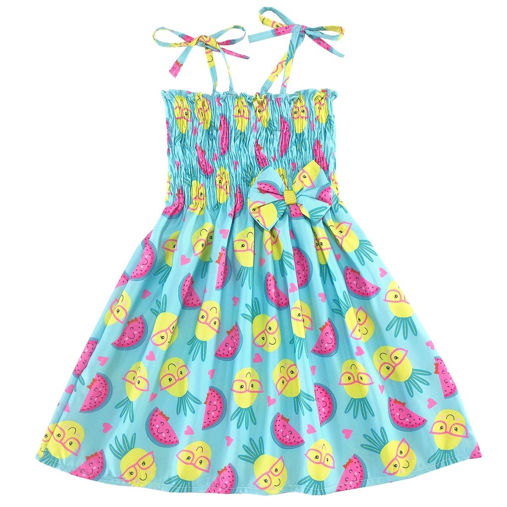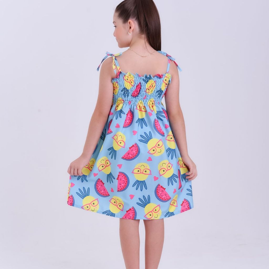 Vestido infantil temático estampa de frutas modelo ciganinha