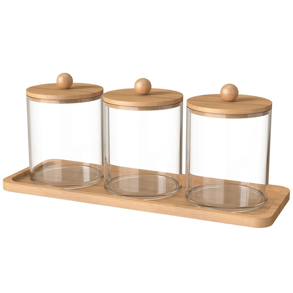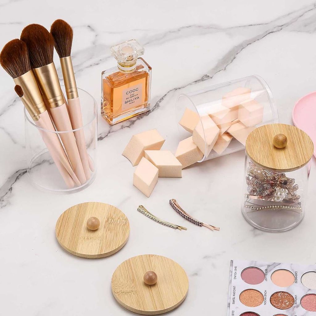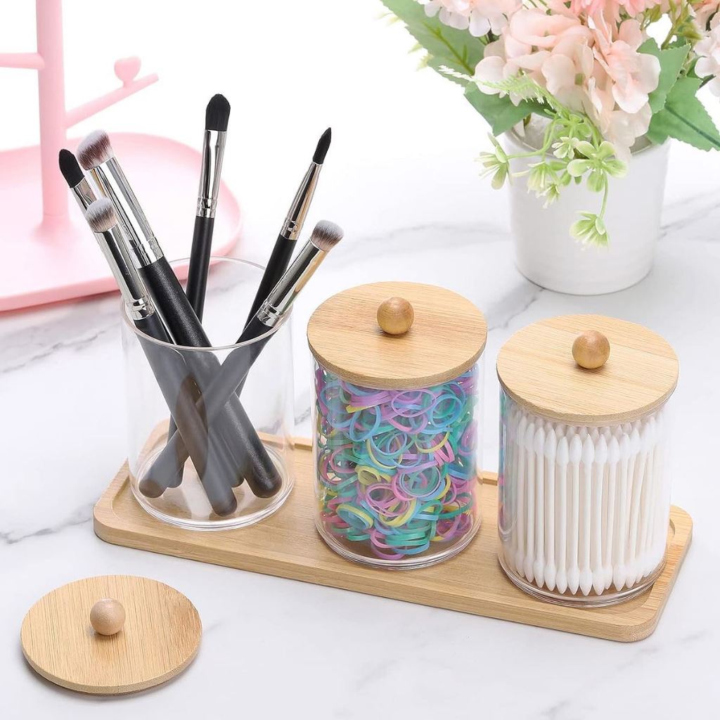 Kit 3 Porta Algodão Cotonete Organizador Acrílico Tampa Bambu Disco Maquiagem