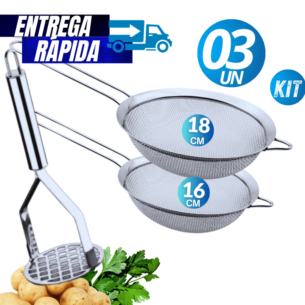 Kit 04/03/02/02 Peneira Coador Manual Em Aço Inox 3 Tamanhos 14cm 16cm 18 + 1 amassador de batata alta Qualidade