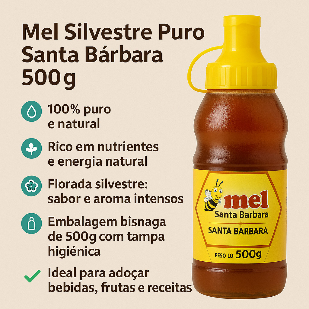 Mel Silvestre Puro Santa Bárbara 500g | Bisnaga Squeeze Natural, Florada Silvestre