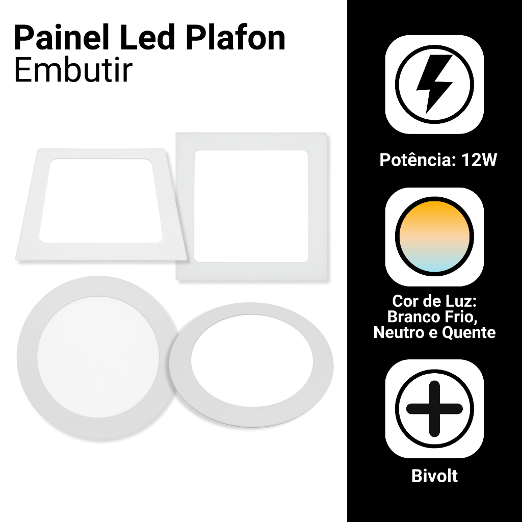 Kit 2 Painel Embutir Led 12w Redondo ou Quadrado Branco Frio | Neutro | Quente