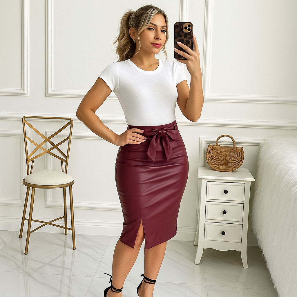 Saia Lápis Couro Fake com Laço Cintura Alta Elegante Evangélica
