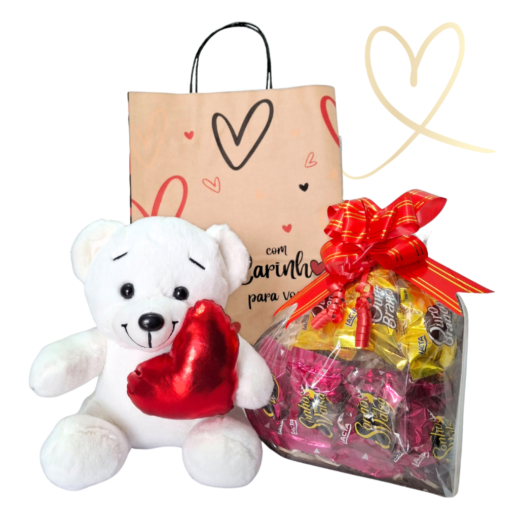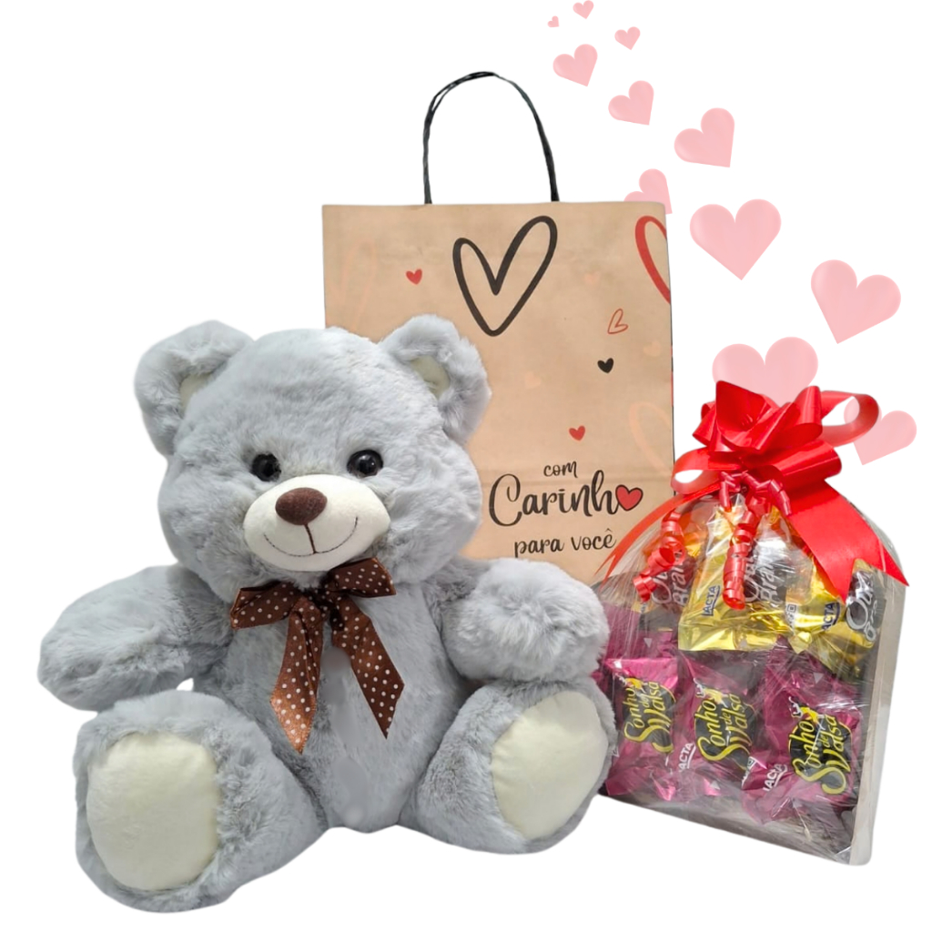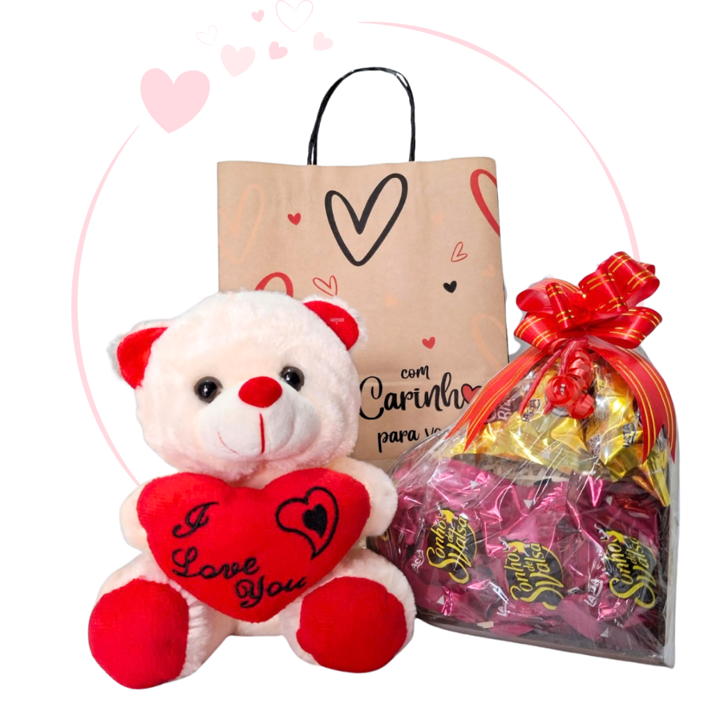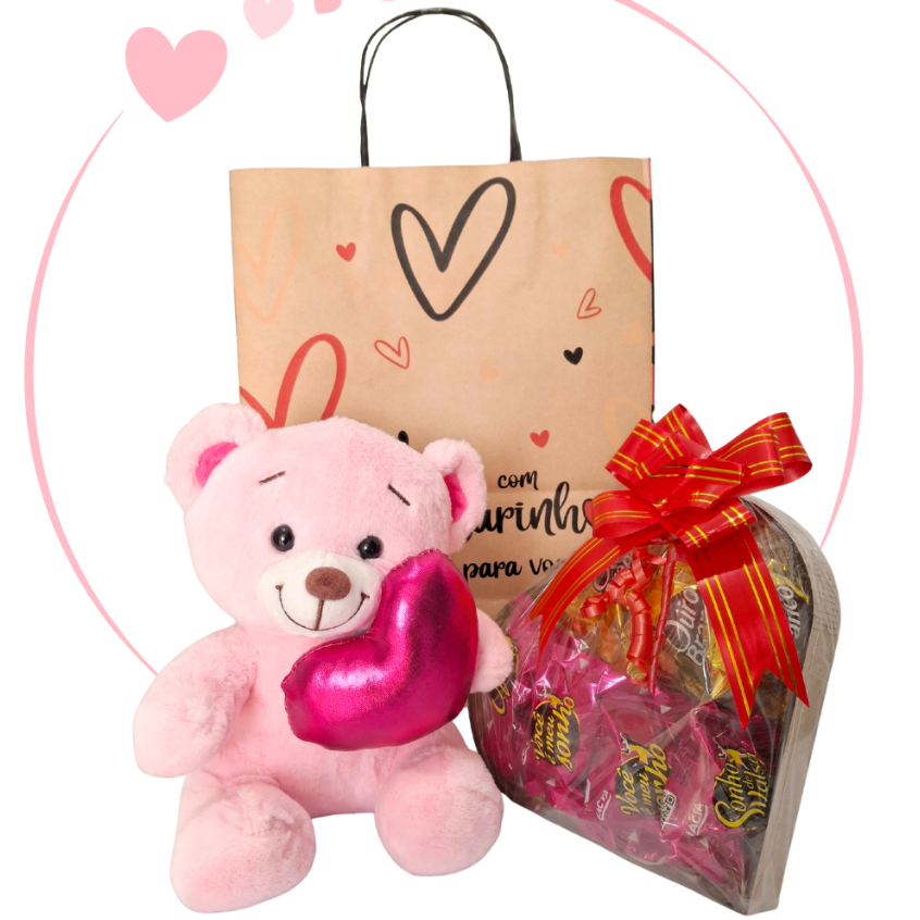 Cesta/Kit Presente - Urso, Coração MDF e Chocolates - Páscoa/Dia das Mães/Aniversário/Dia Namorados