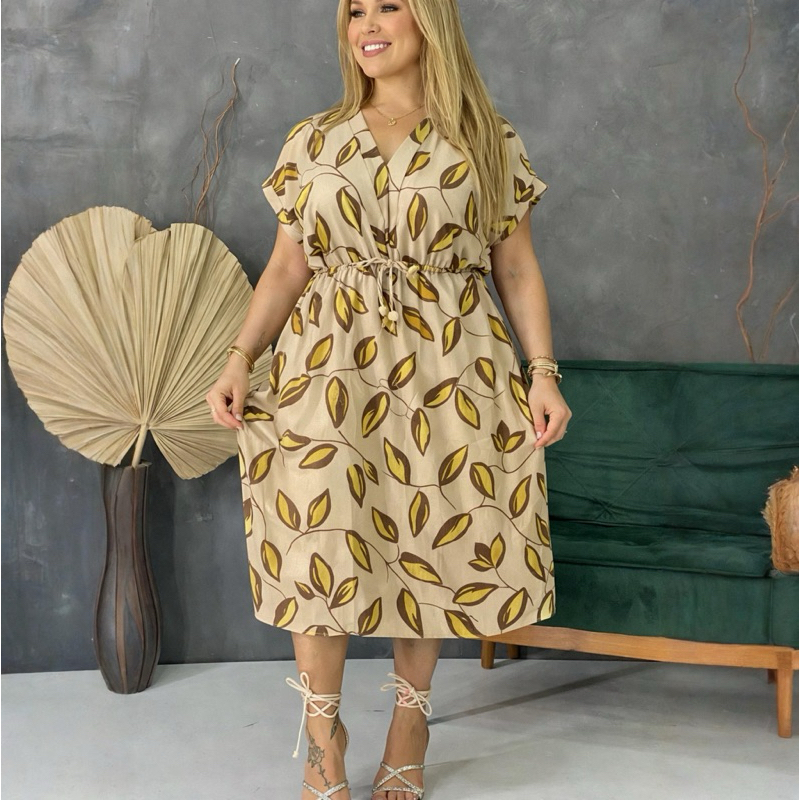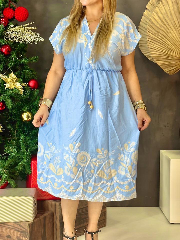 Vestido Midi Estampado Forrado com Gola V Elastico Ajustavel na Cintura e Manga Flare
