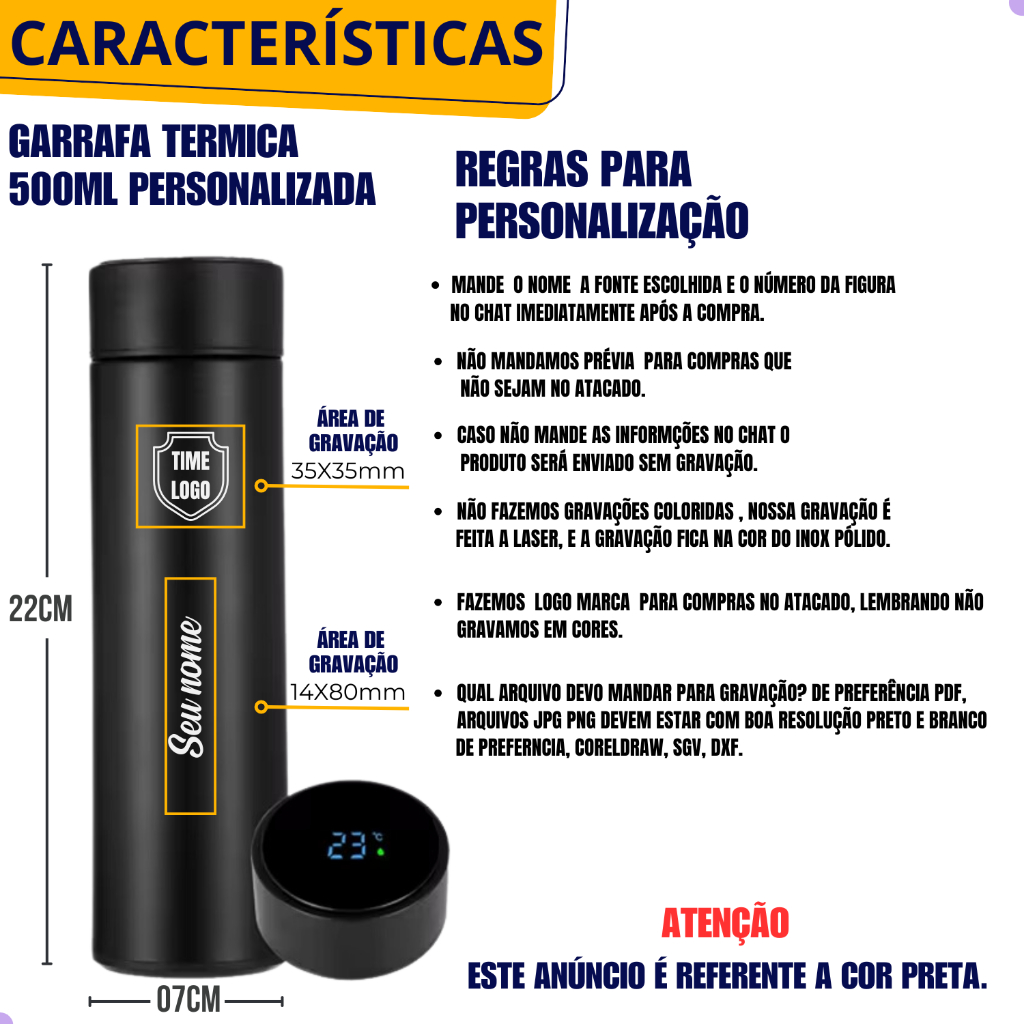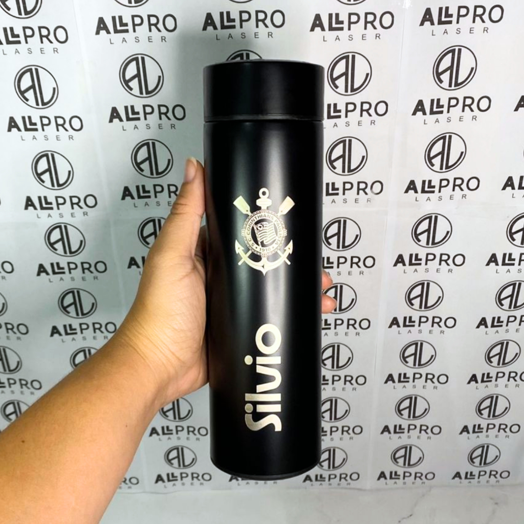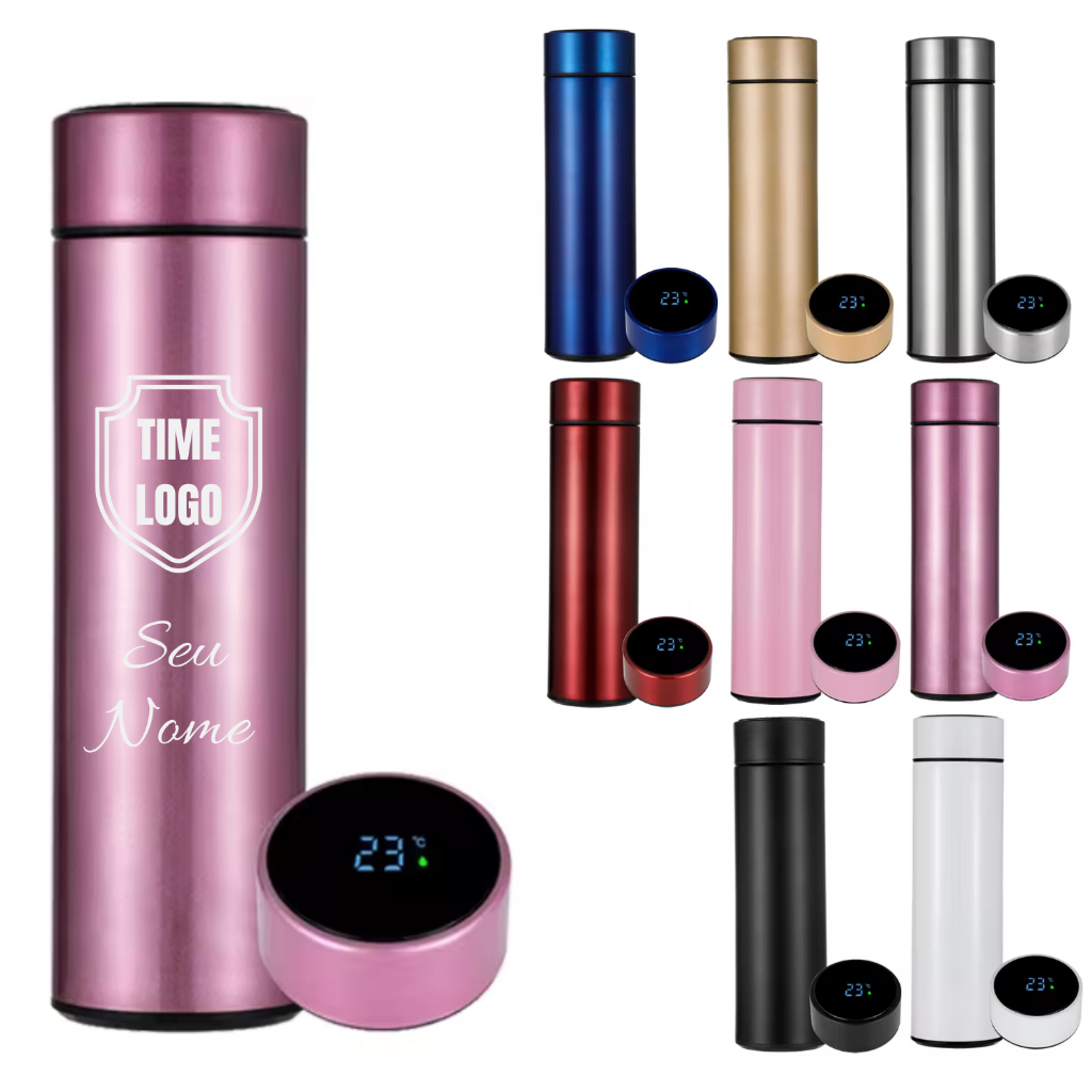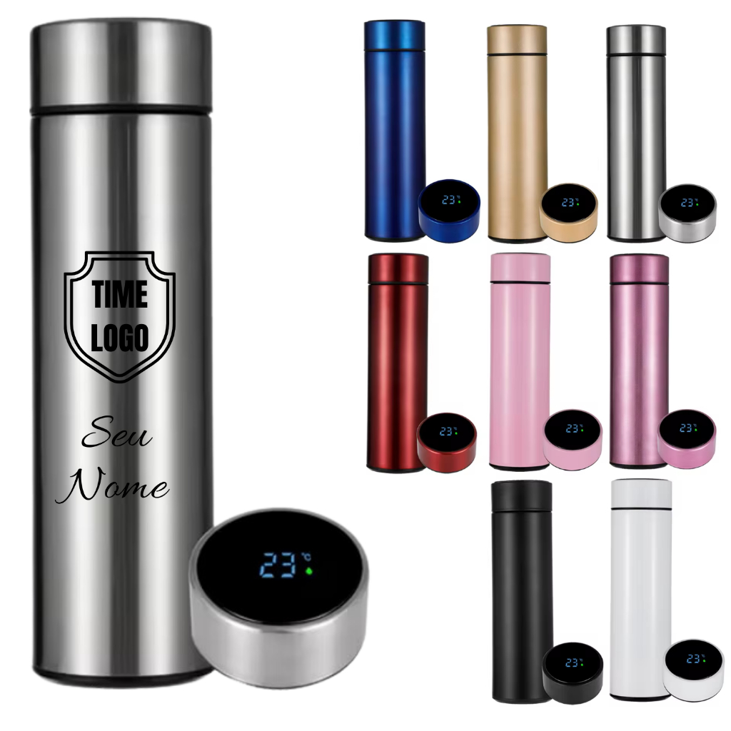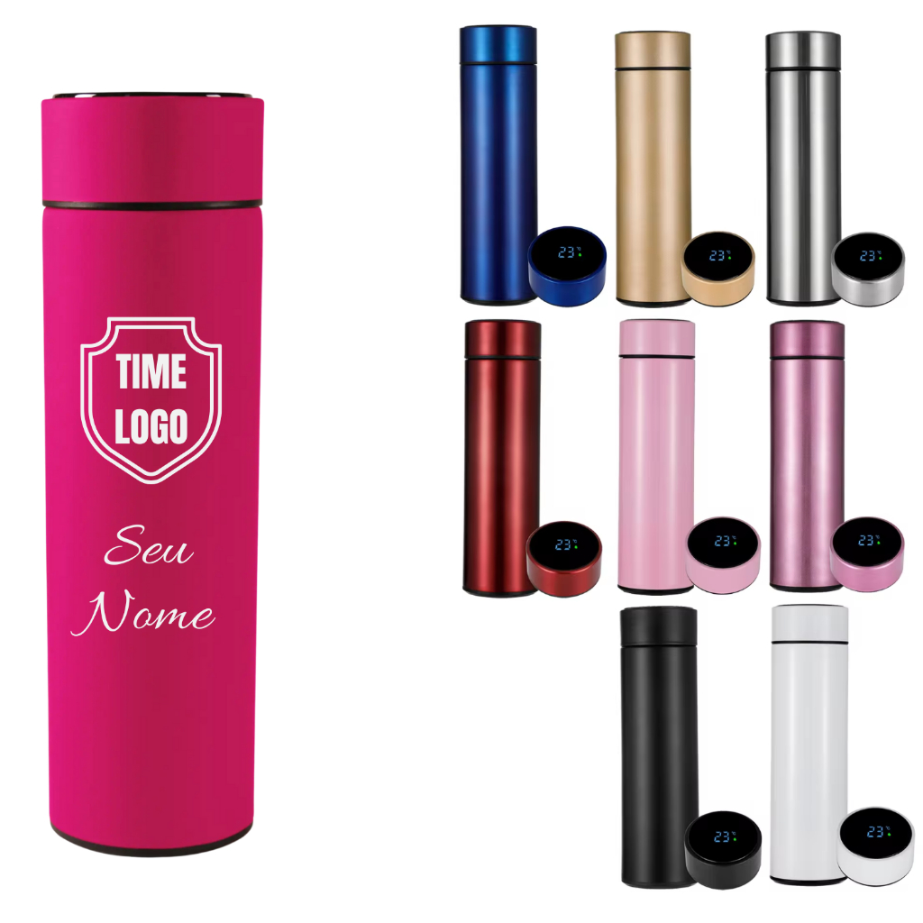 Garrafa Térmica Medidor Temperatura Termômetro LED 500ml Personalizada Logo Nome Times