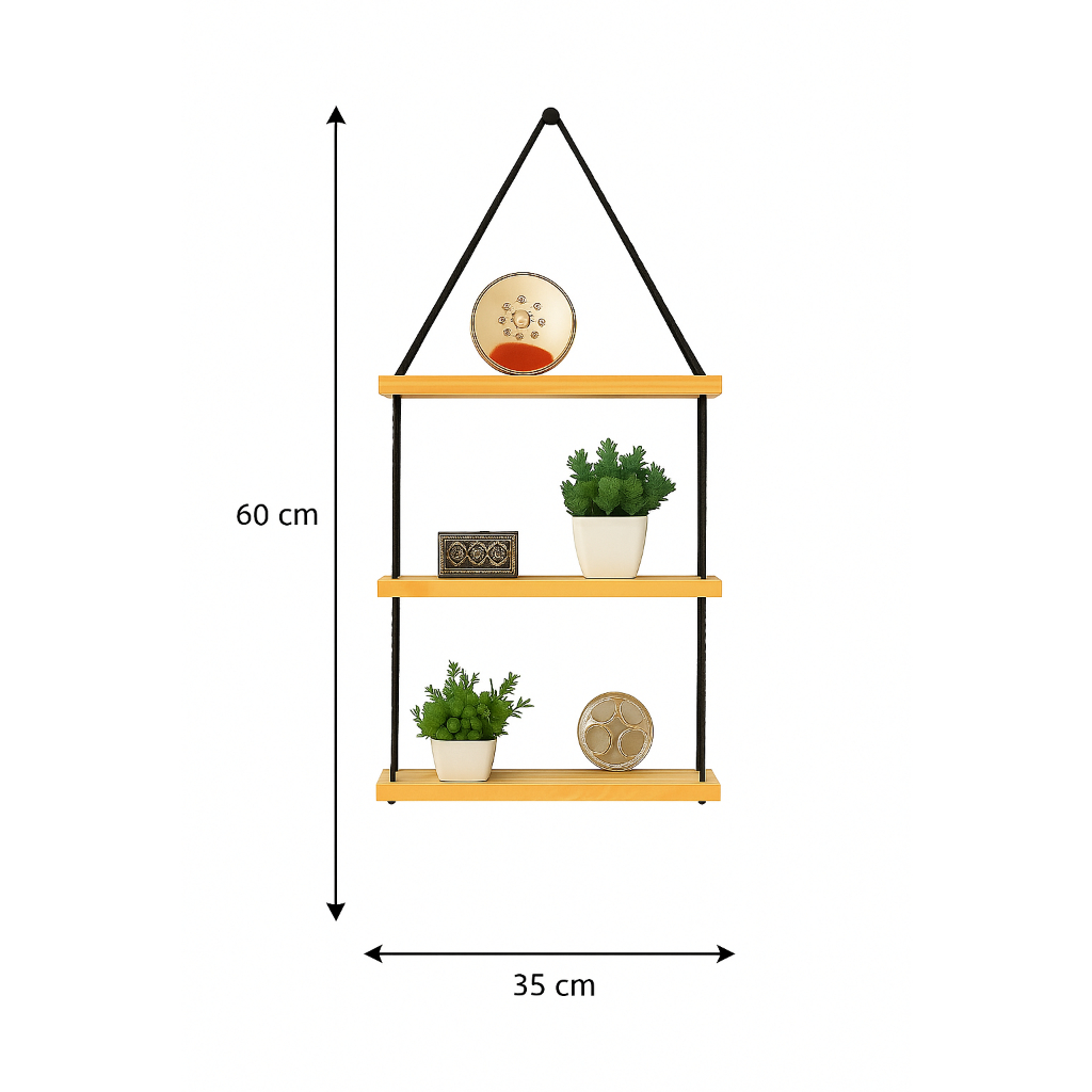 Prateleira Suspensa de Madeira com 3 Andares, 35x60cm, Corda Preta, Estilo Minimalista para Decoração Parede Tendencia