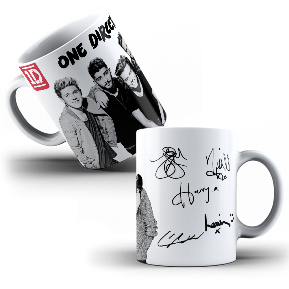 Caneca Porcelana One Direction Harry, Louis, Niall, Zayn e Liam Assinaturas e Foto