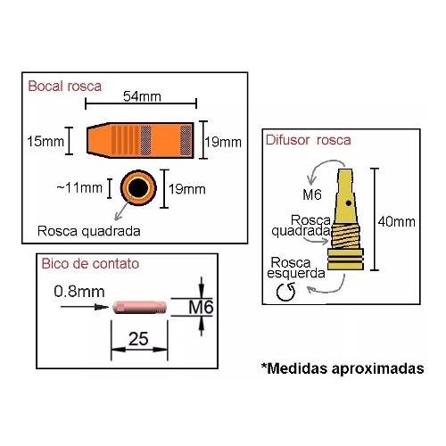 Kit Tocha Solda Mig 0.8mm Bocal Bico Difusor C/ Rosca - 5 Pçs