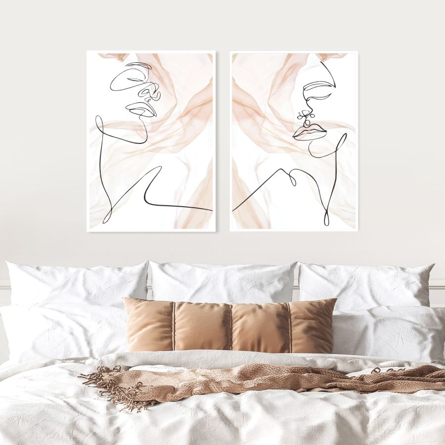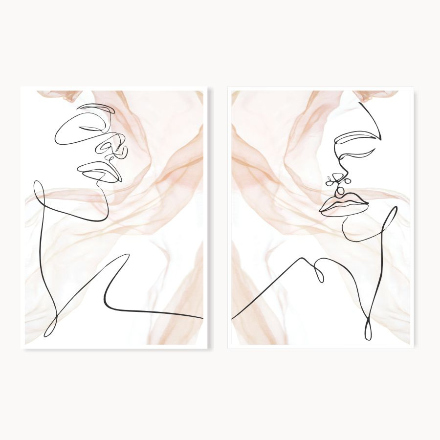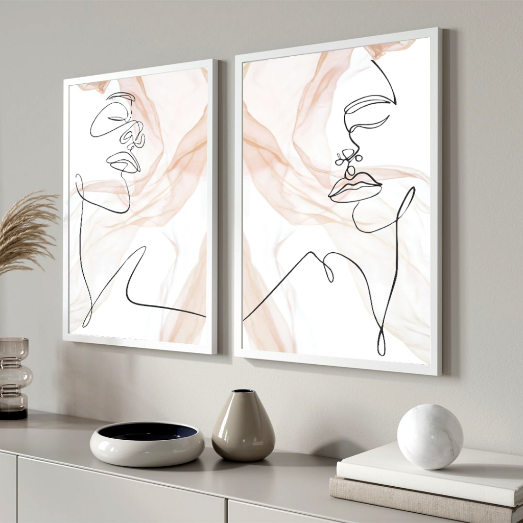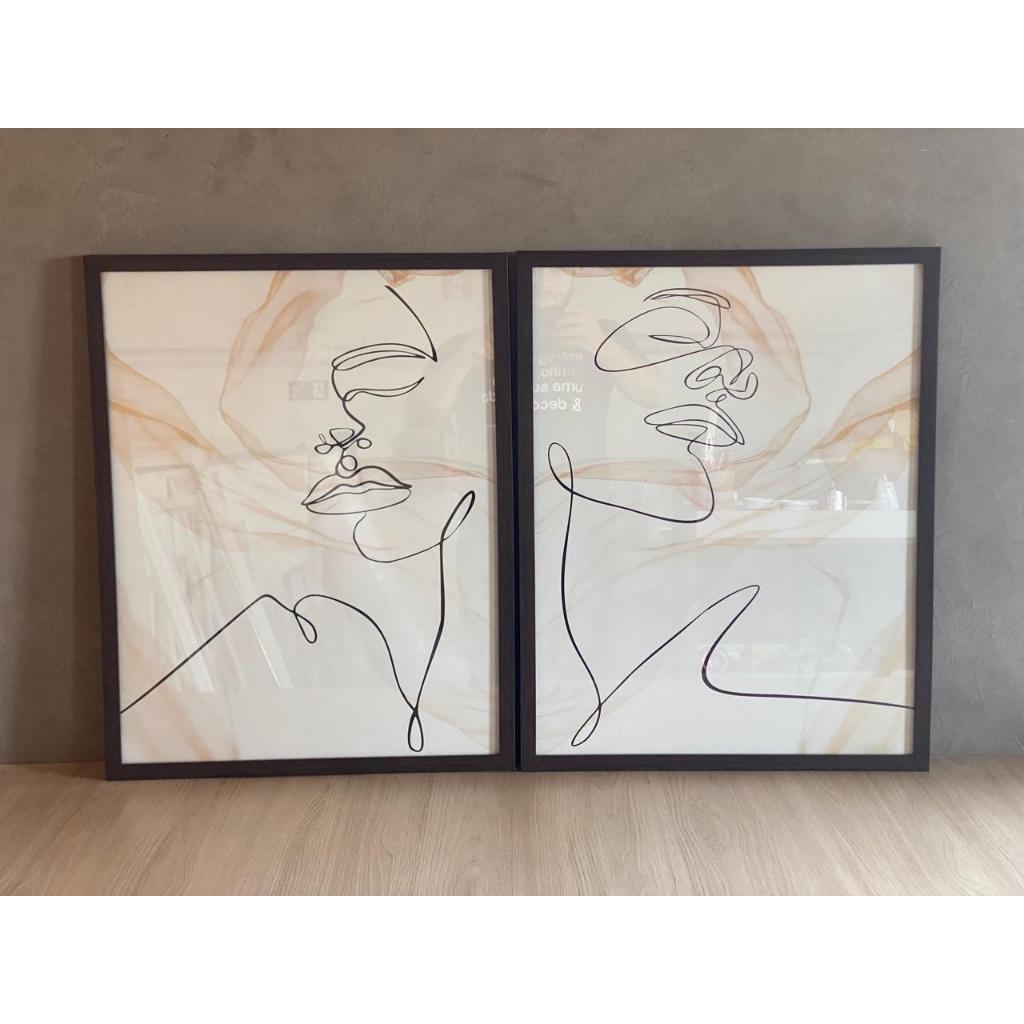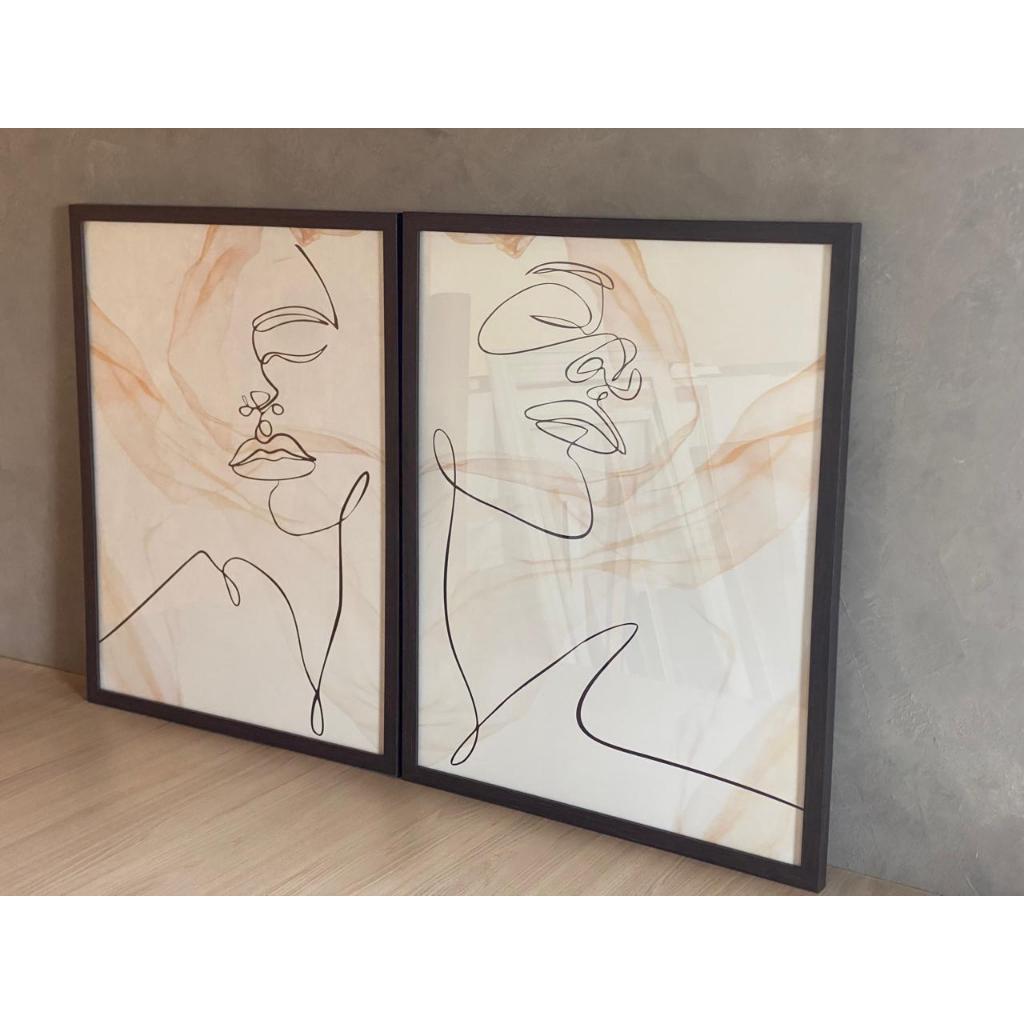 Dupla de Quadros Decorativos Mulher Minimalista Silhueta Tons Claros Moldura Caixa Dupla de Quadros