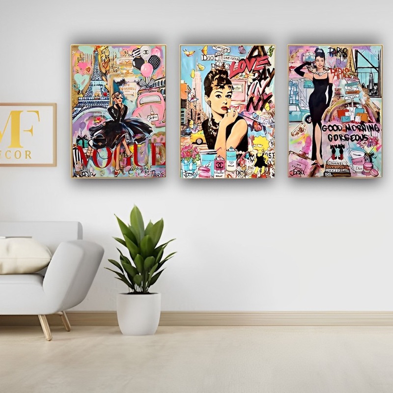 Quadro decorativo 3 peças 122x60 moderno chique elegante Moda grafite rua pop arte mulher para sala quarto