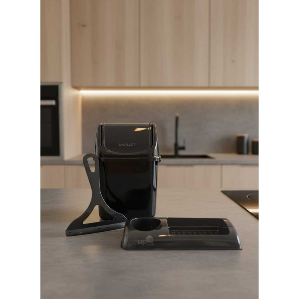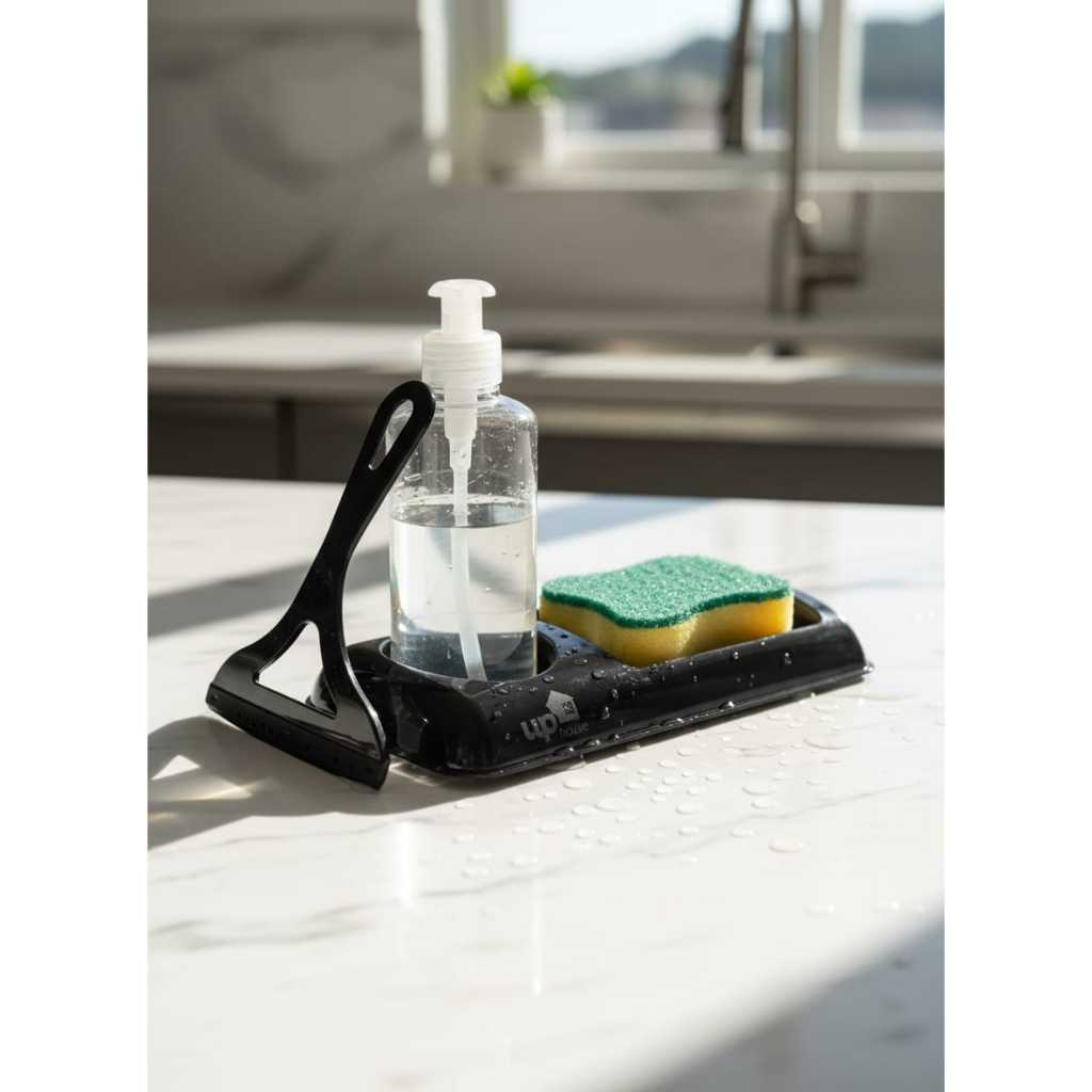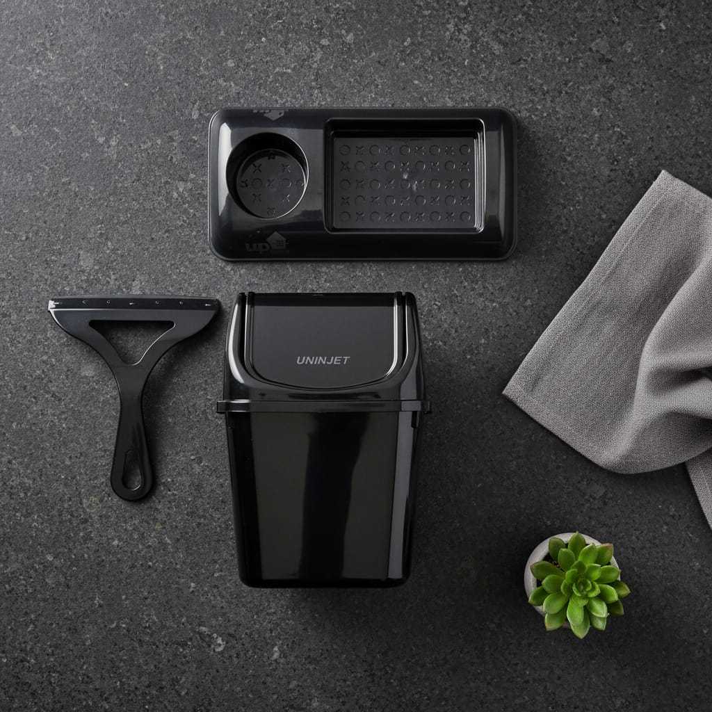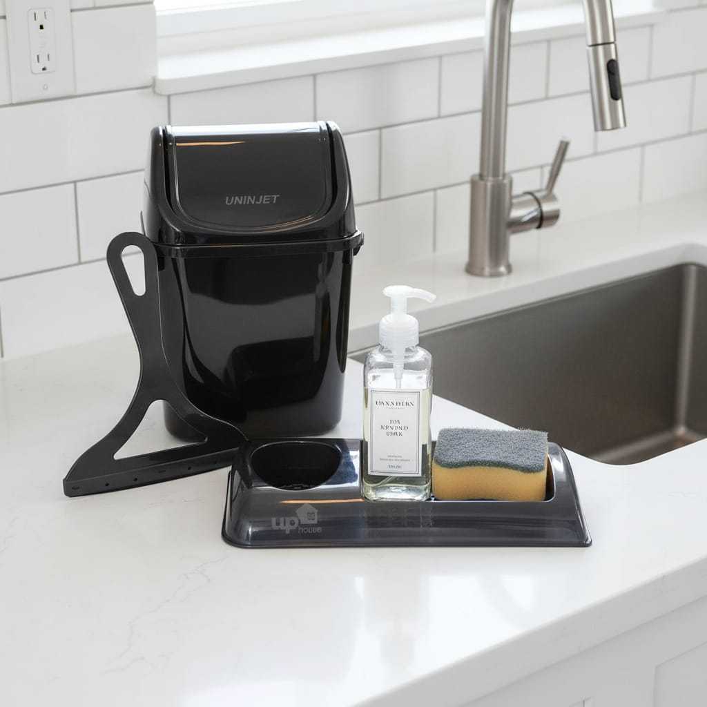 Kit Organizador de Pia Preto Brilhante com Lixeira Basculante Rodinho e Porta Detergente