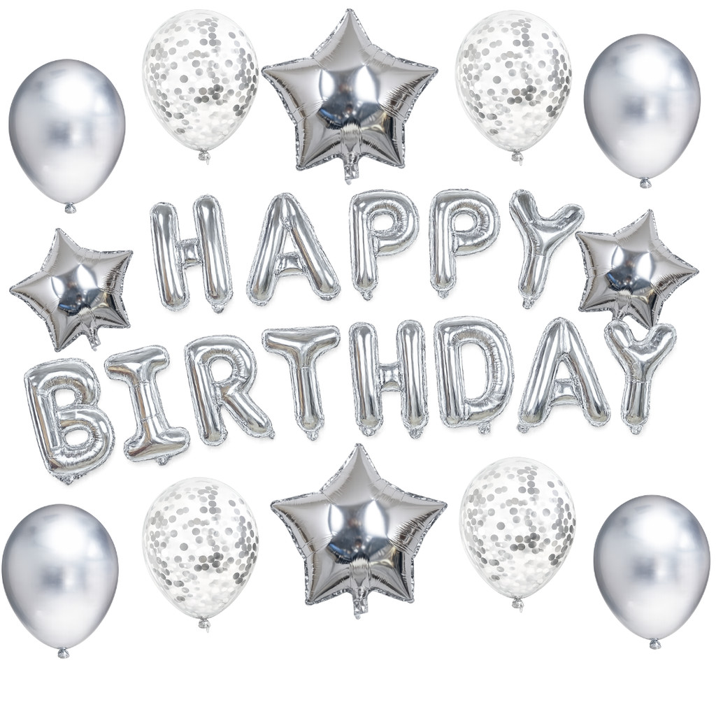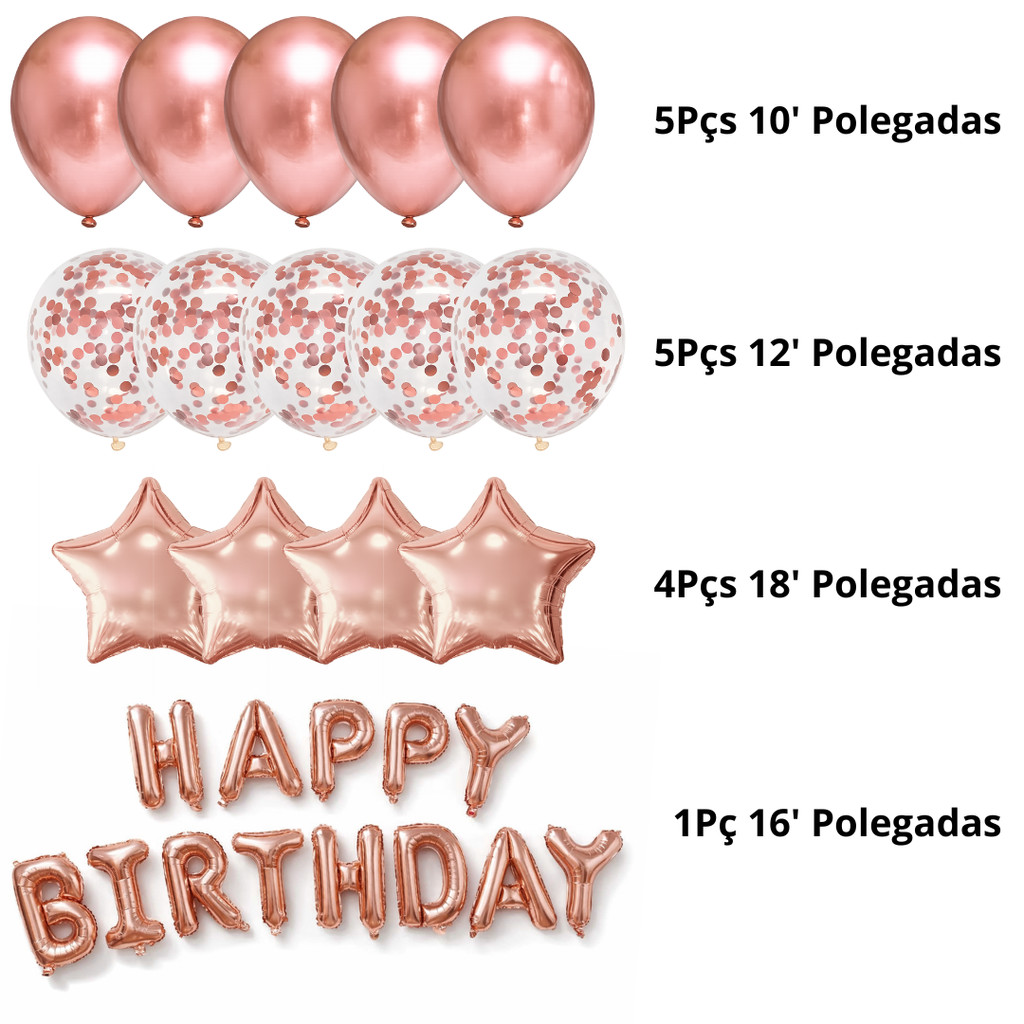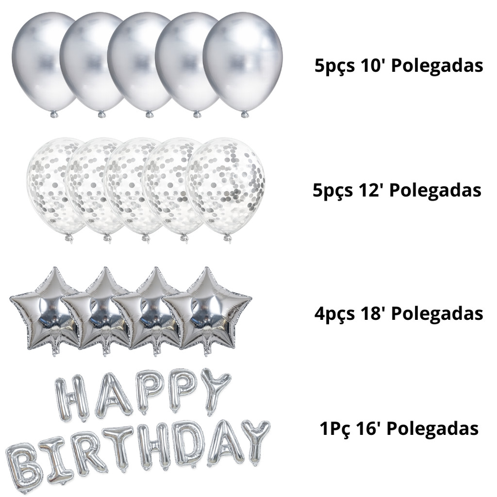 Kit de Balões Happy Birthday + Bexigas de Confete e Cromado Para Decoração de Festa de Aniversario