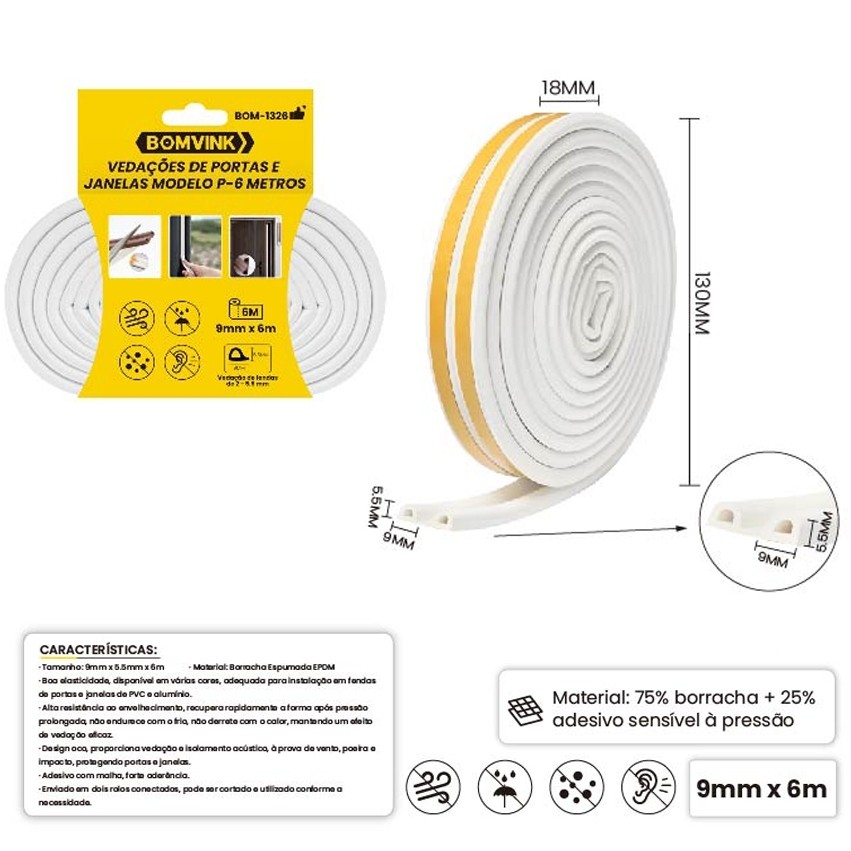 Fita Veda Frestas Janelas Porta Adesivo Isolante Térmico Antirruído 5.5x9mm 6 Metros