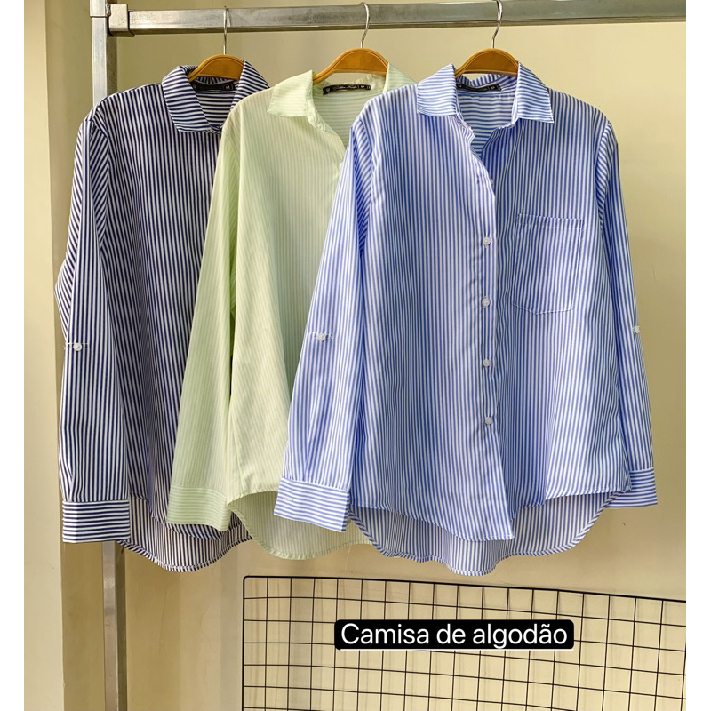 Camisa Social Feminina Risca De Giz Listras Fino Tendência em algodão #03