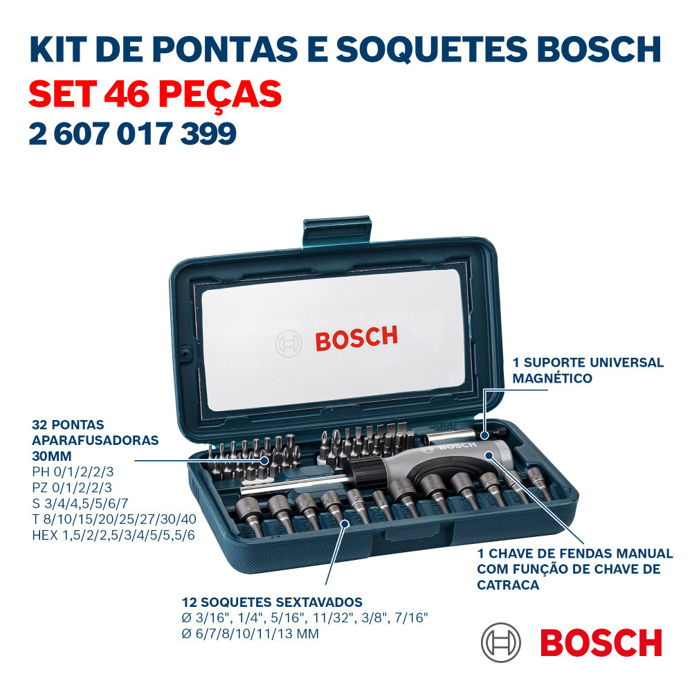 Kit Bits e Soquetes Bosch com 46 Peças Extra Hard Phillips Fenda Pozidriv Torx