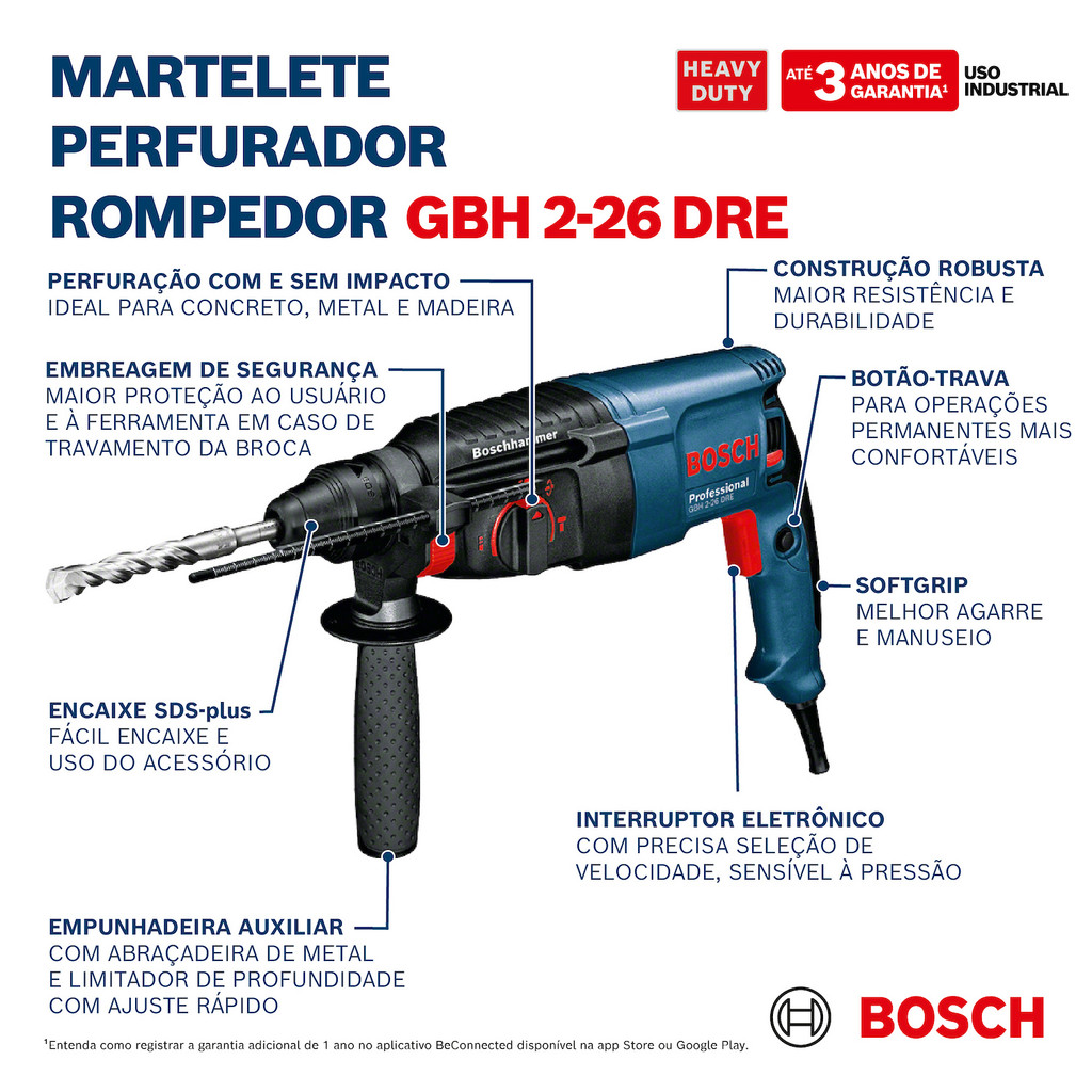 Martelete Perfurador GBH 2-26 DRE Bosch Rompedor SDS-Plus 800W com Maleta