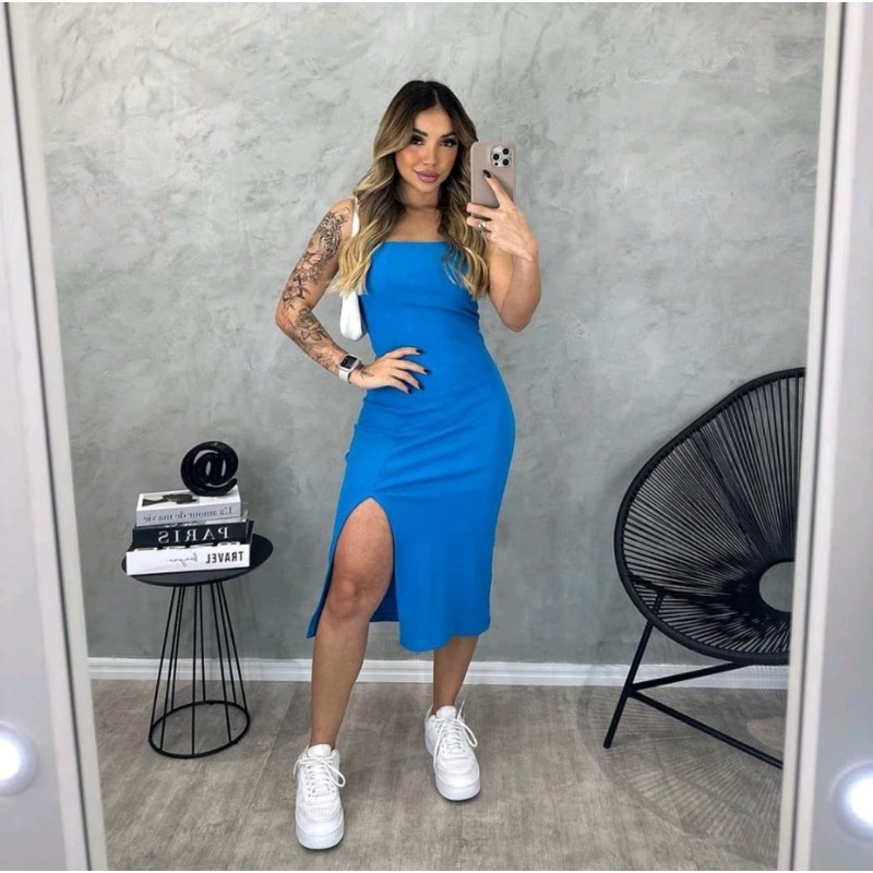 Vestido Mídi Fenda Tomara que caia COM BOJO Canelado AnaRuga
