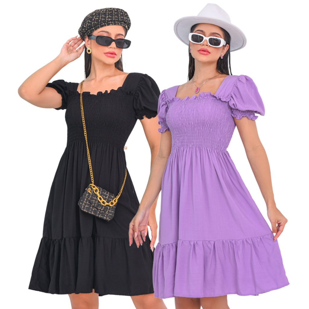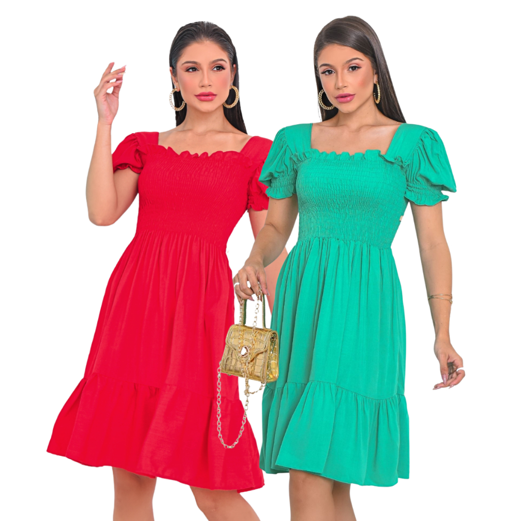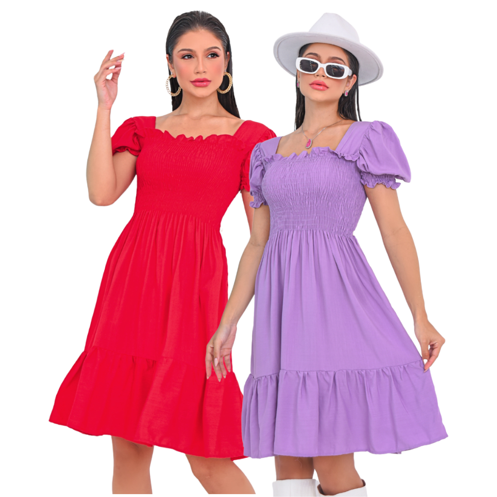 Kit 2 Vestido Feminino Manga Curta Bufante Com Lastex Babado